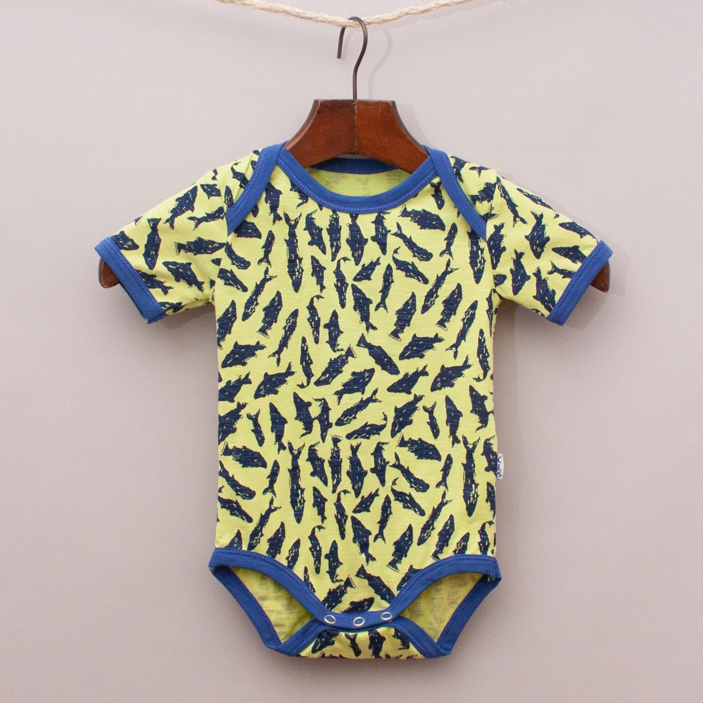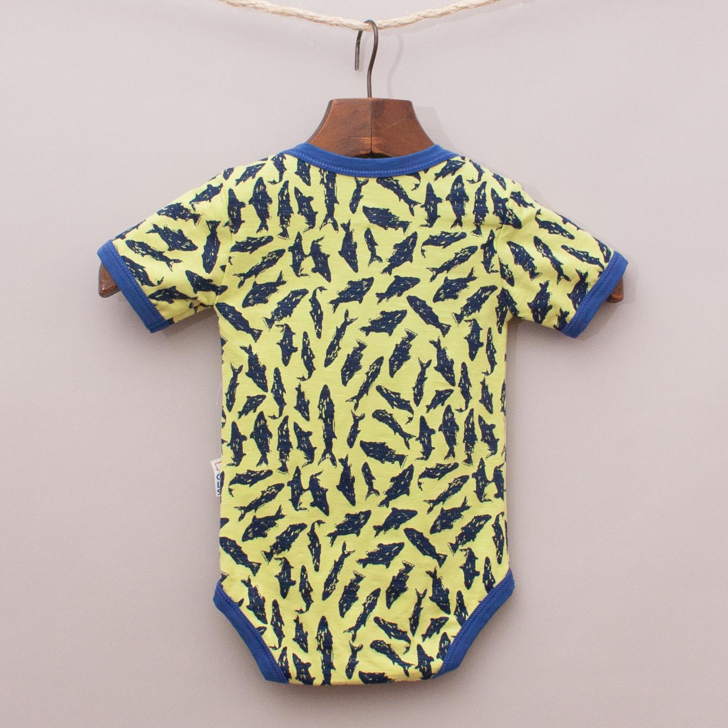 Claesens "brand new with tags" bright yellow and blue short sleeve romper with fish pattern throughout and button up closure