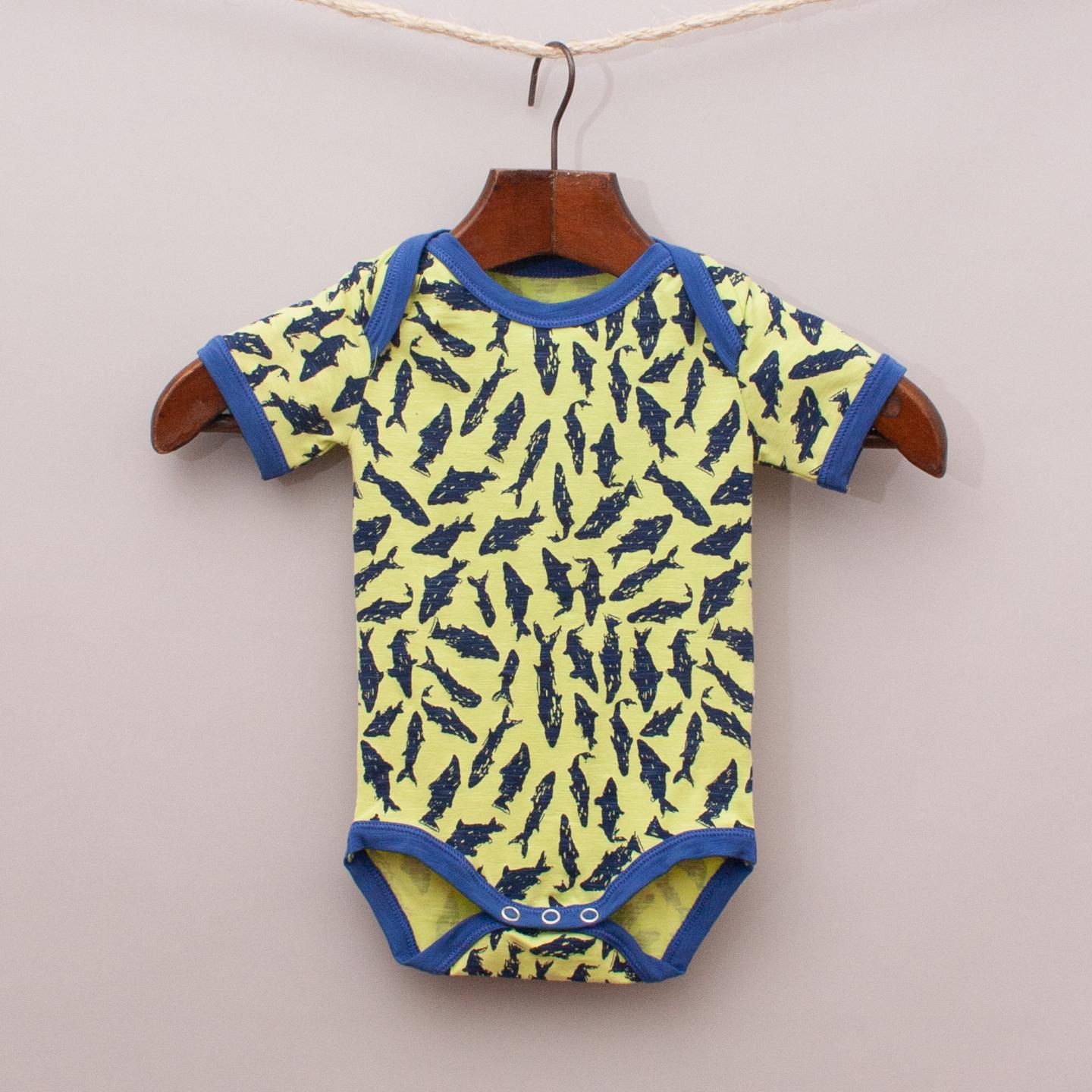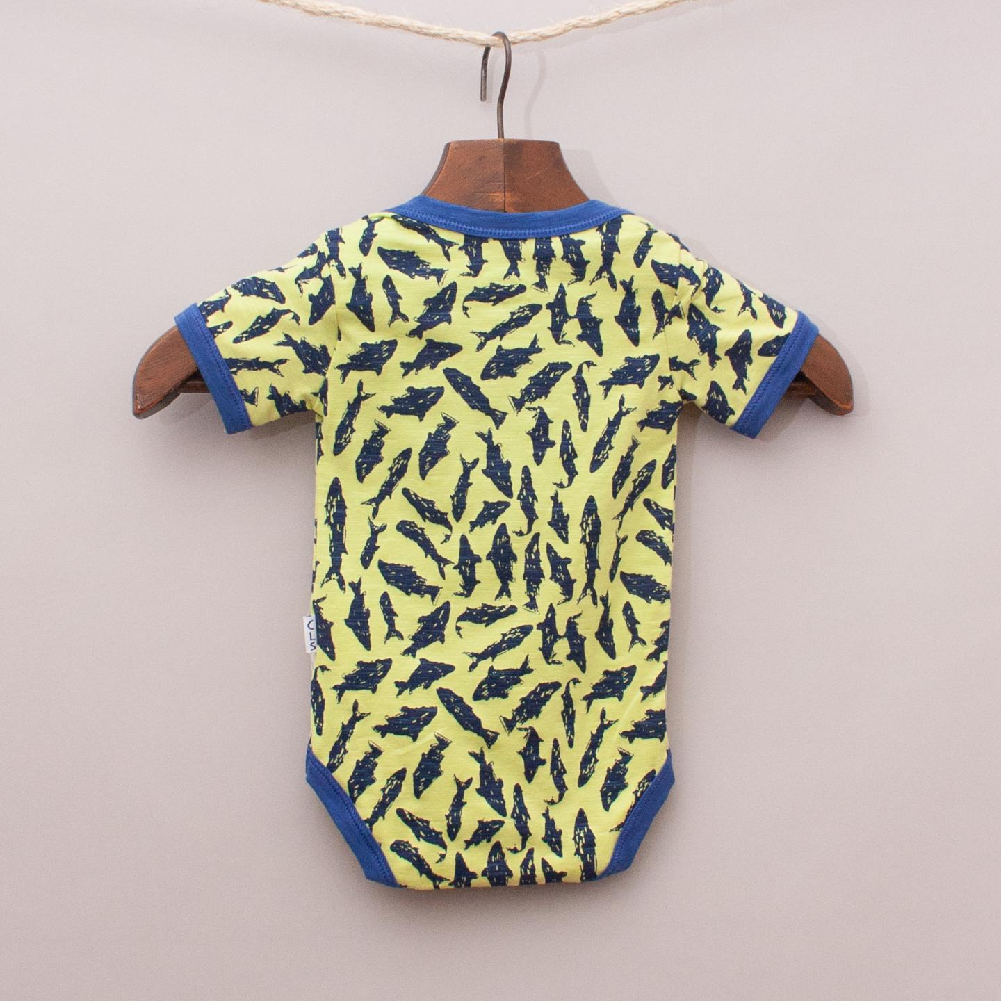 Claesens "brand new with tags" bright yellow and blue short sleeve romper with fish pattern throughout and button up closure