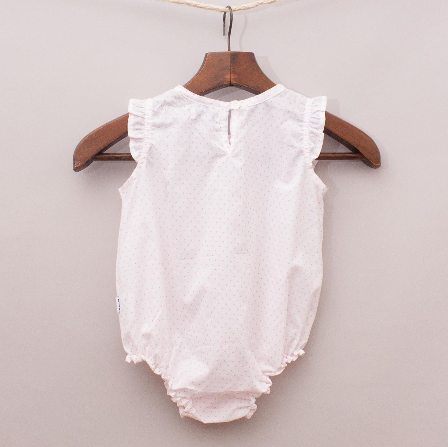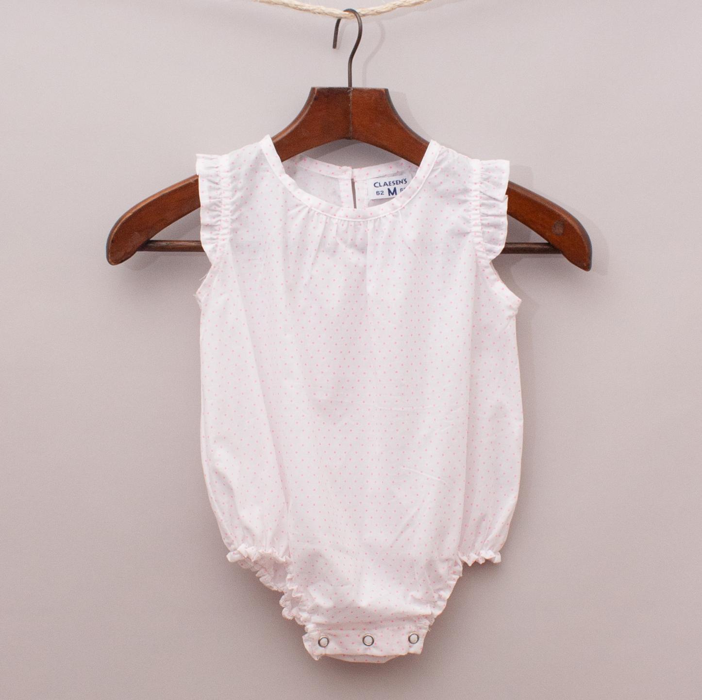 Claesens "brand new with tags" white sheer romper with hot pink polka dot pattern throughout, ruffled sleeves and button up closure
