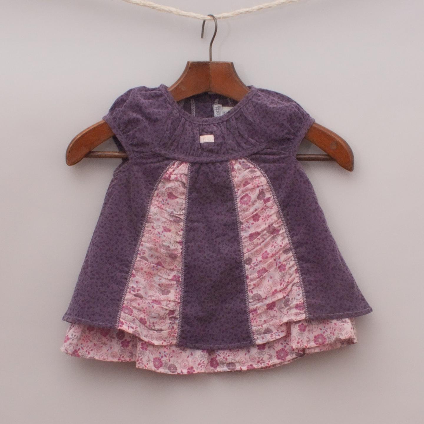 Confetti purple corduroy smock with contrasting pink floral panels, ruffled hemline, puffed sleeves and button down back closure
