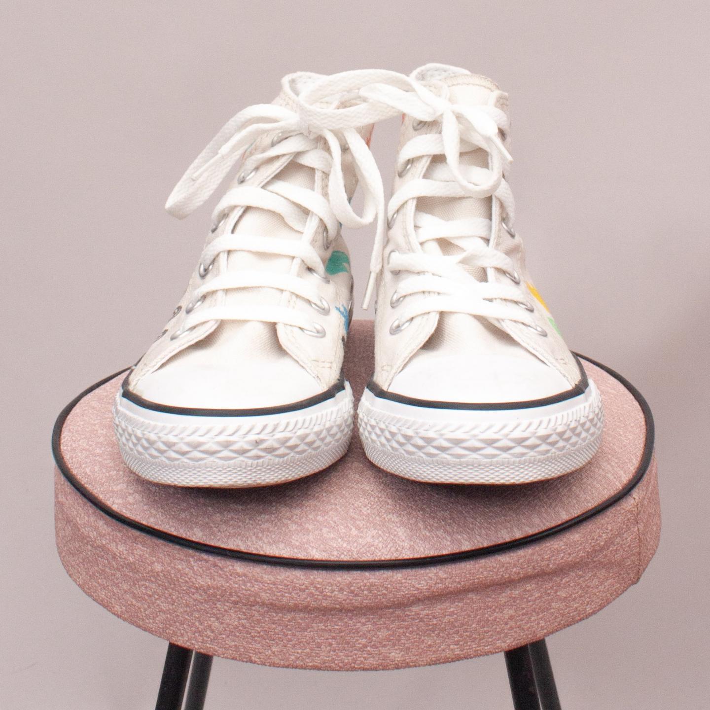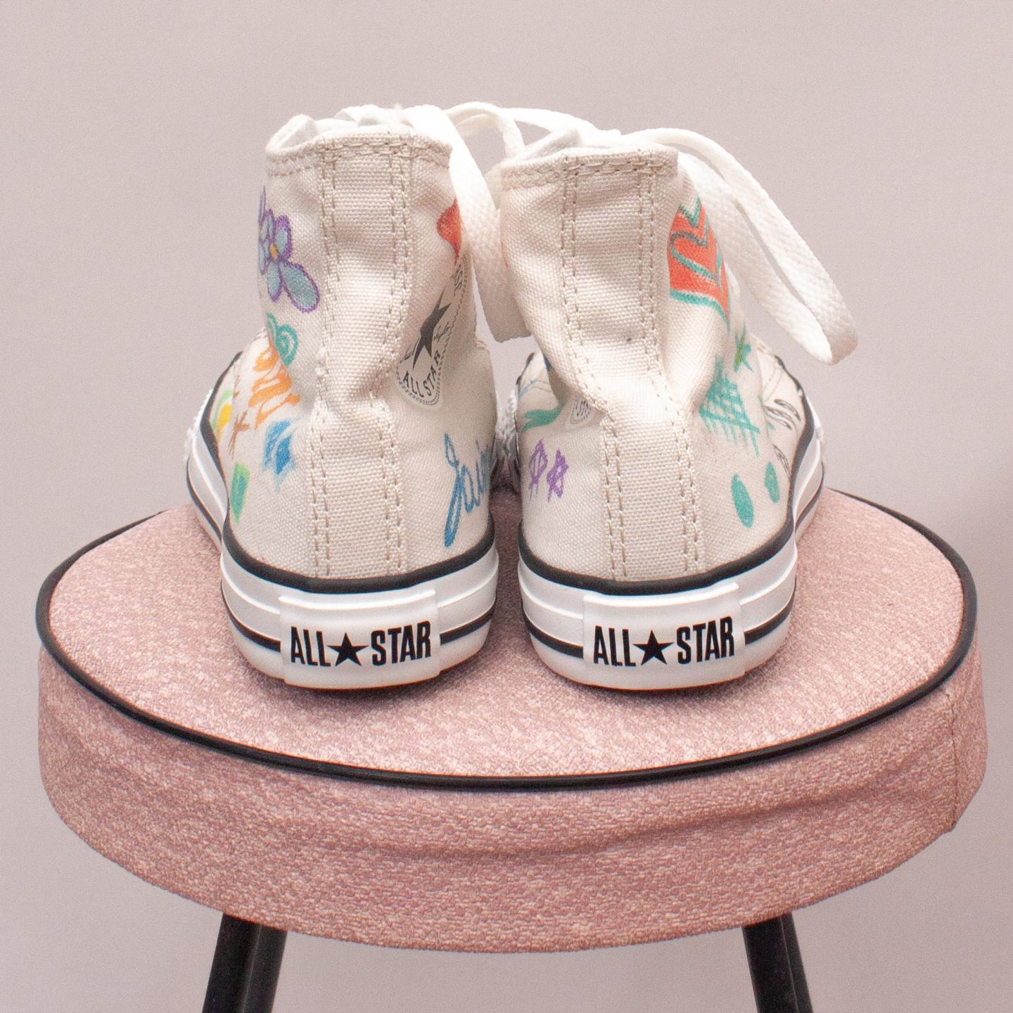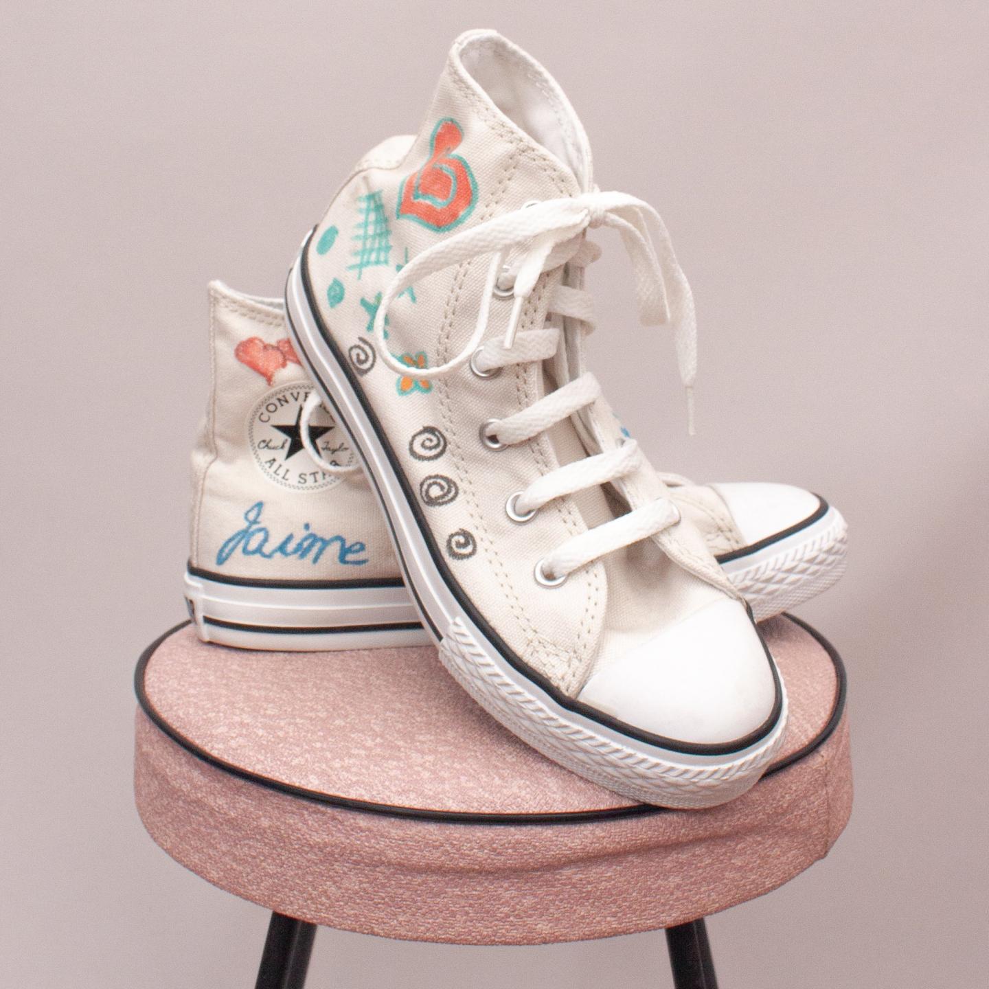 Converse white lace up's with unique drawings throughout, white laces and sturdy rubber soles - Size EU 32 (Age 6 Approx.)