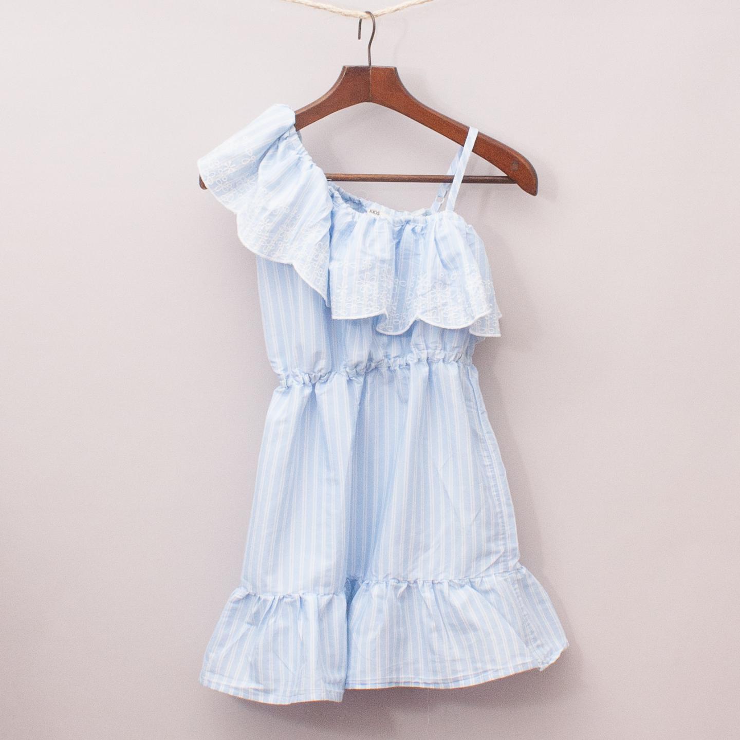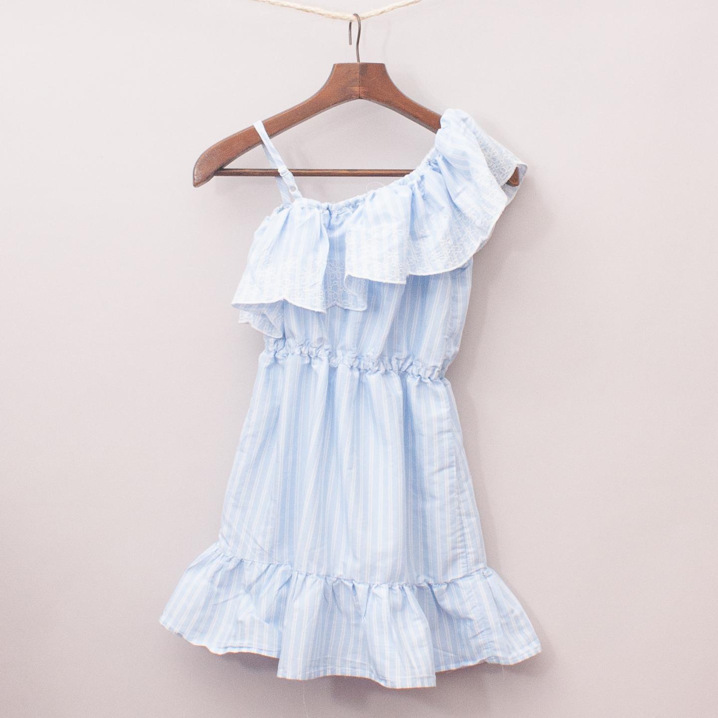 Cotton On pastel blue and white striped dress with large embroidered ruffle detail, elastic waistband and adjustable strap *67% Polyester, 33% Cotton