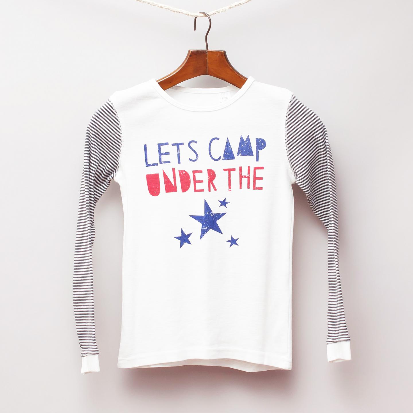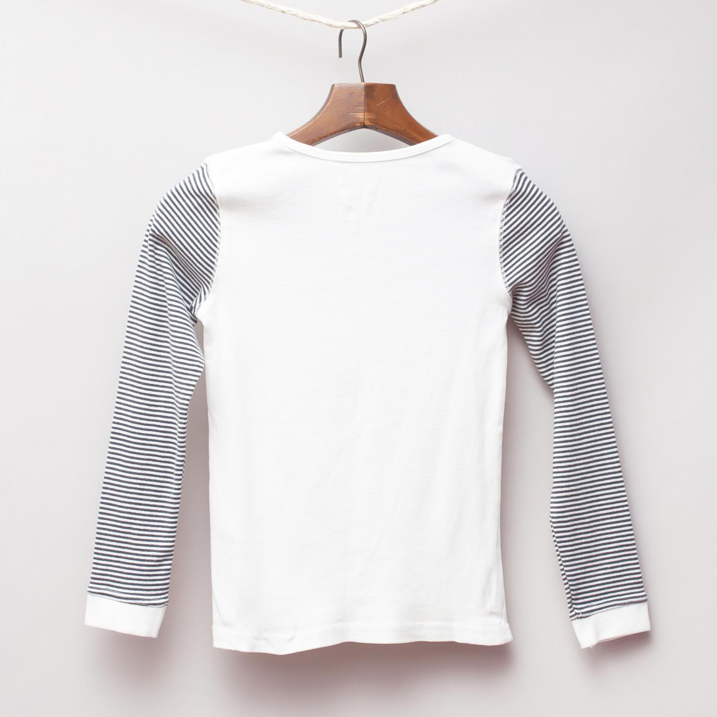 Cotton On Kids white long sleeve top with striped arms, contrasting white body with blue and red printed logo on front