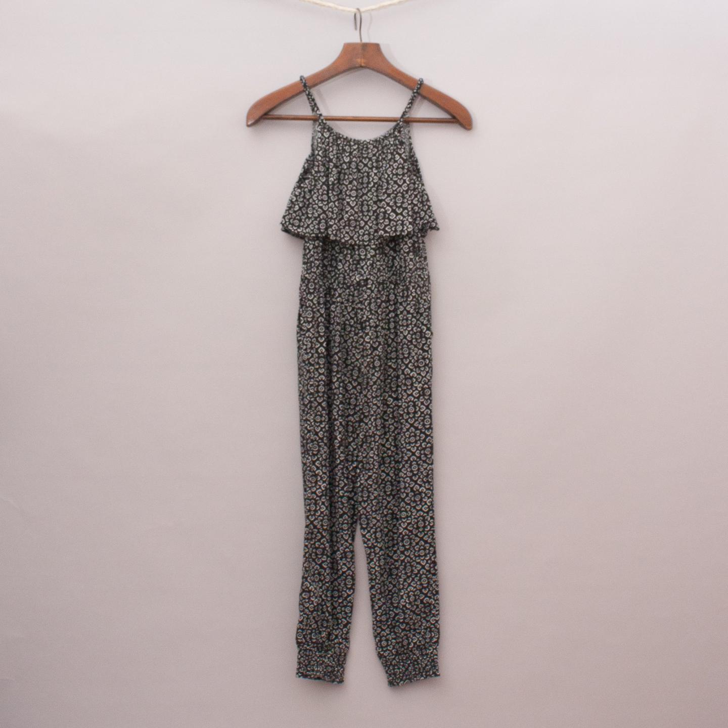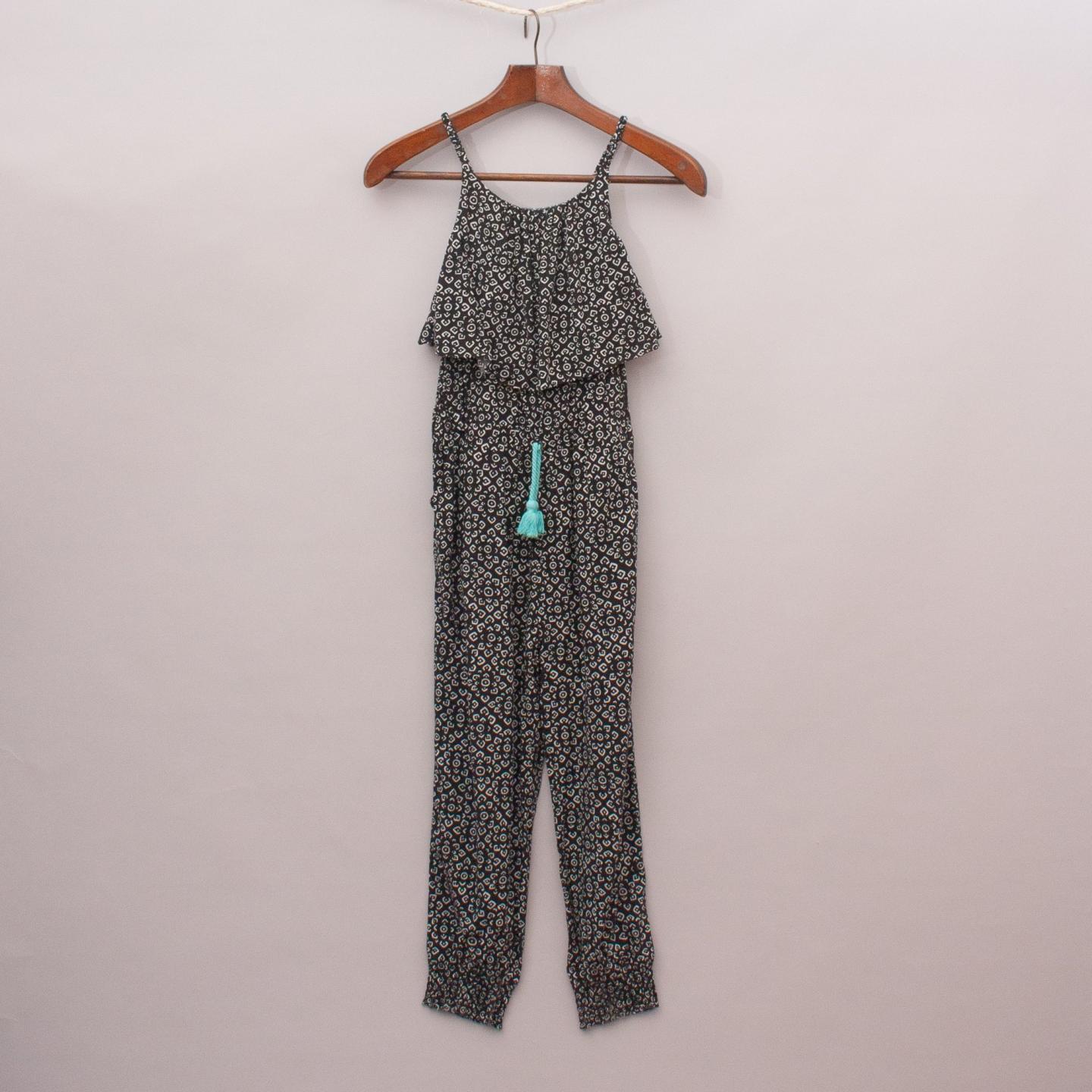 Cotton On black and white patterned jumpsuit with elastic waistband and cuffs, loose top overlay and tie up waist