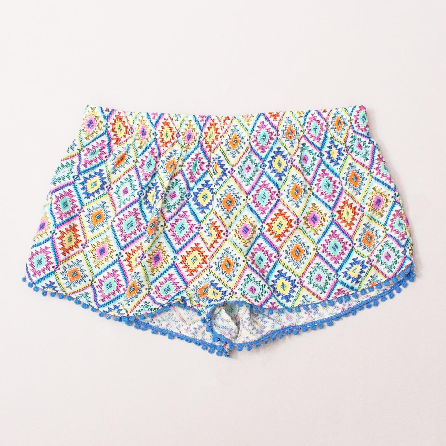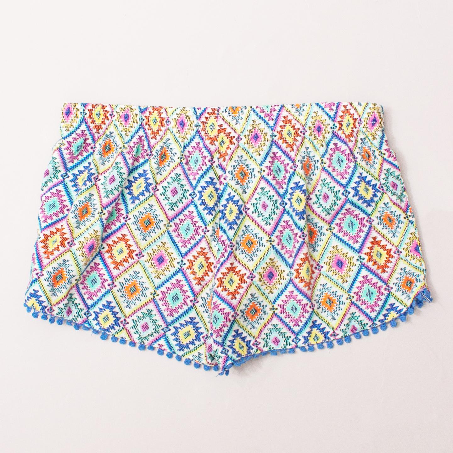 Cotton On brightly coloured patterned shorts with small blue pom pom trim and elastic waistband