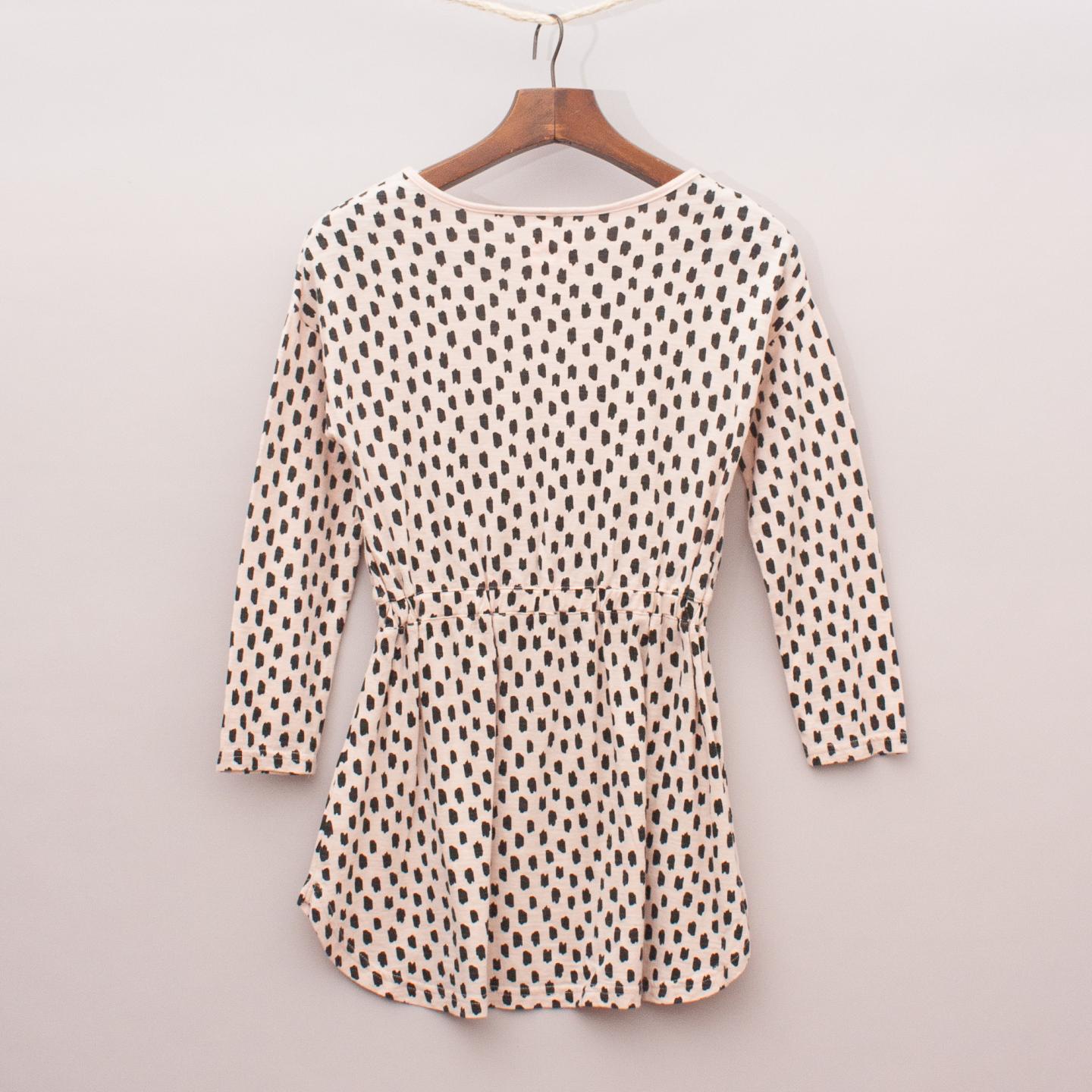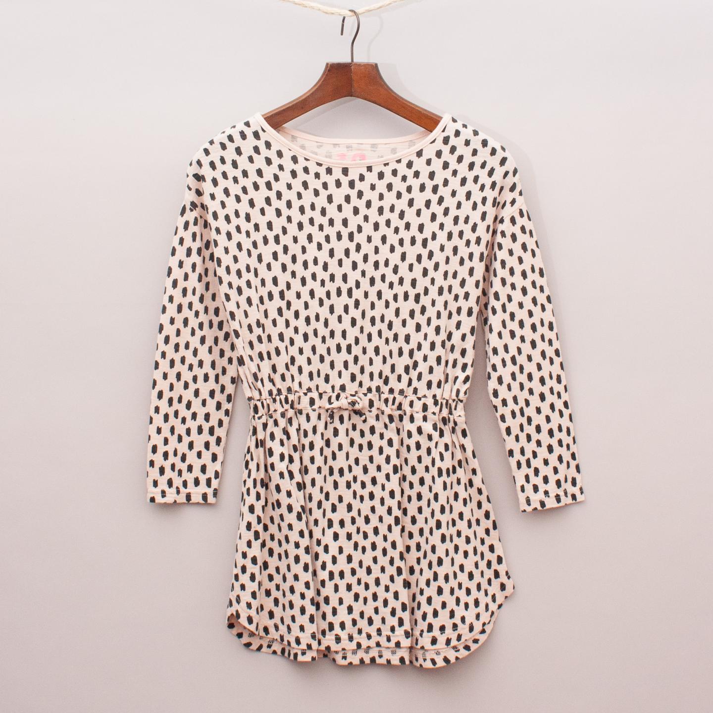 Cotton On pastel pink long sleeve dress with black spotted pattern throughout, rounded hemline and elastic tie waistband