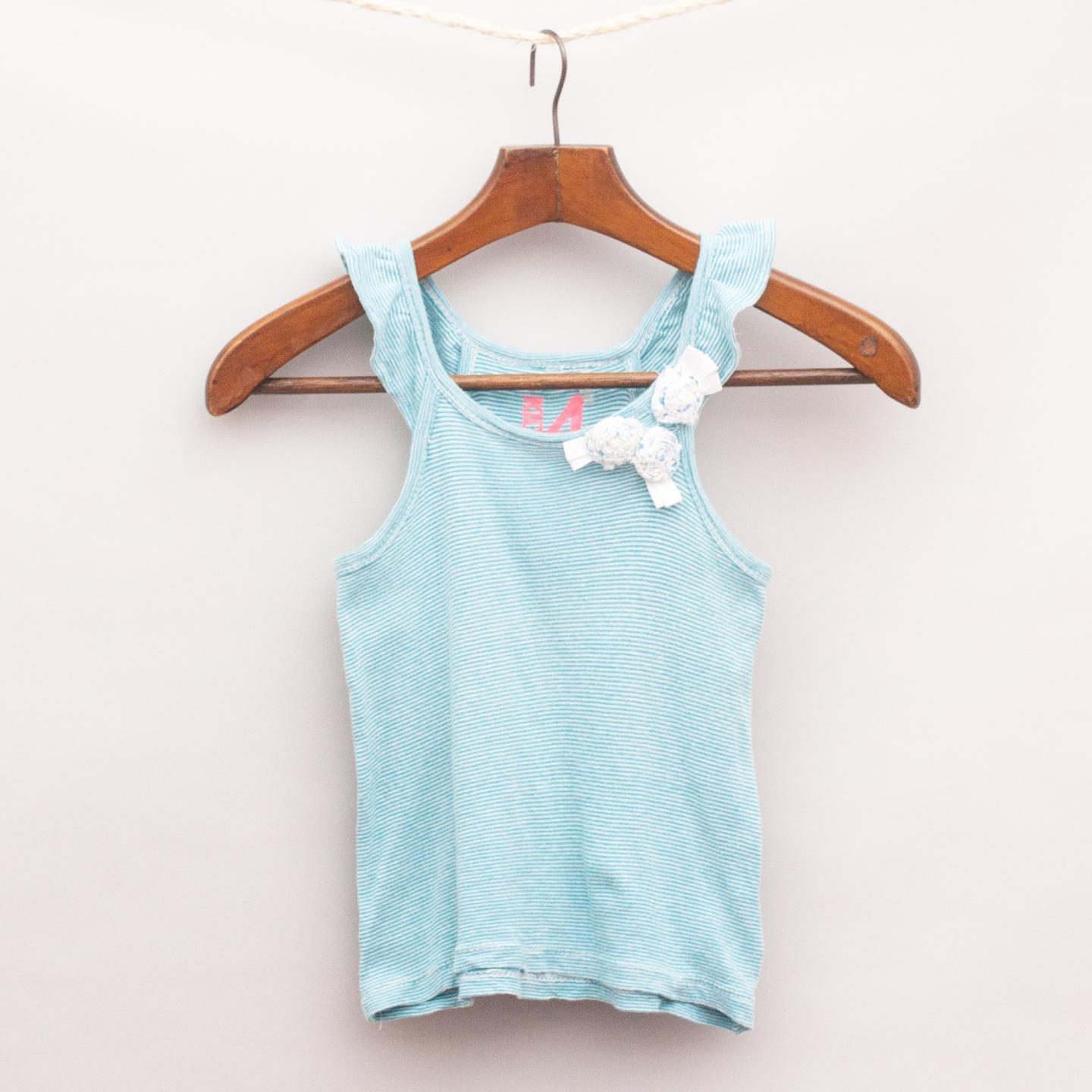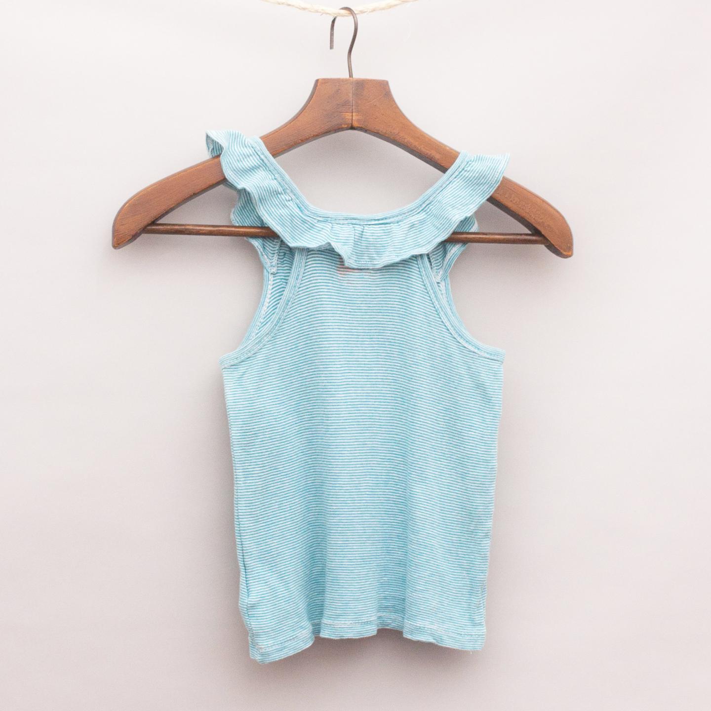 Cotton On blue and white striped singlet top with ruffled shoulders and twisted fabric flowers on the front