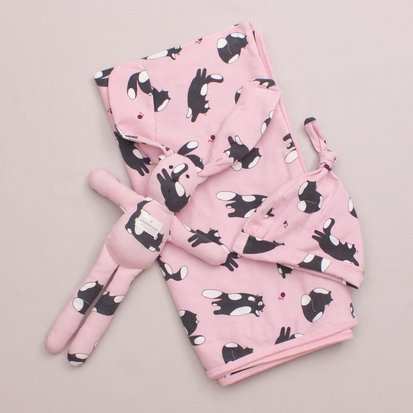 Country Road pastel pink and cat patterned baby set, including swaddle blanket, baby hat and soft toy *97% Cotton, 3% Elastane
