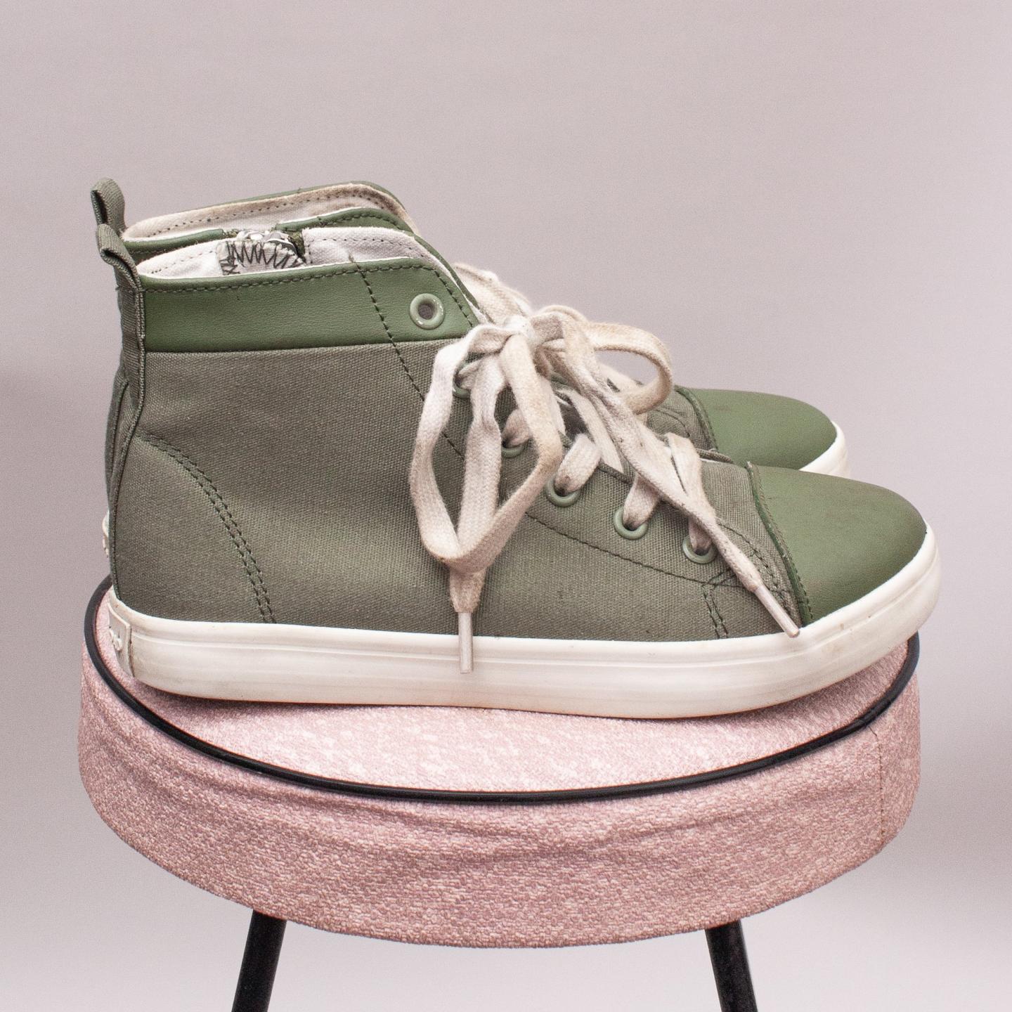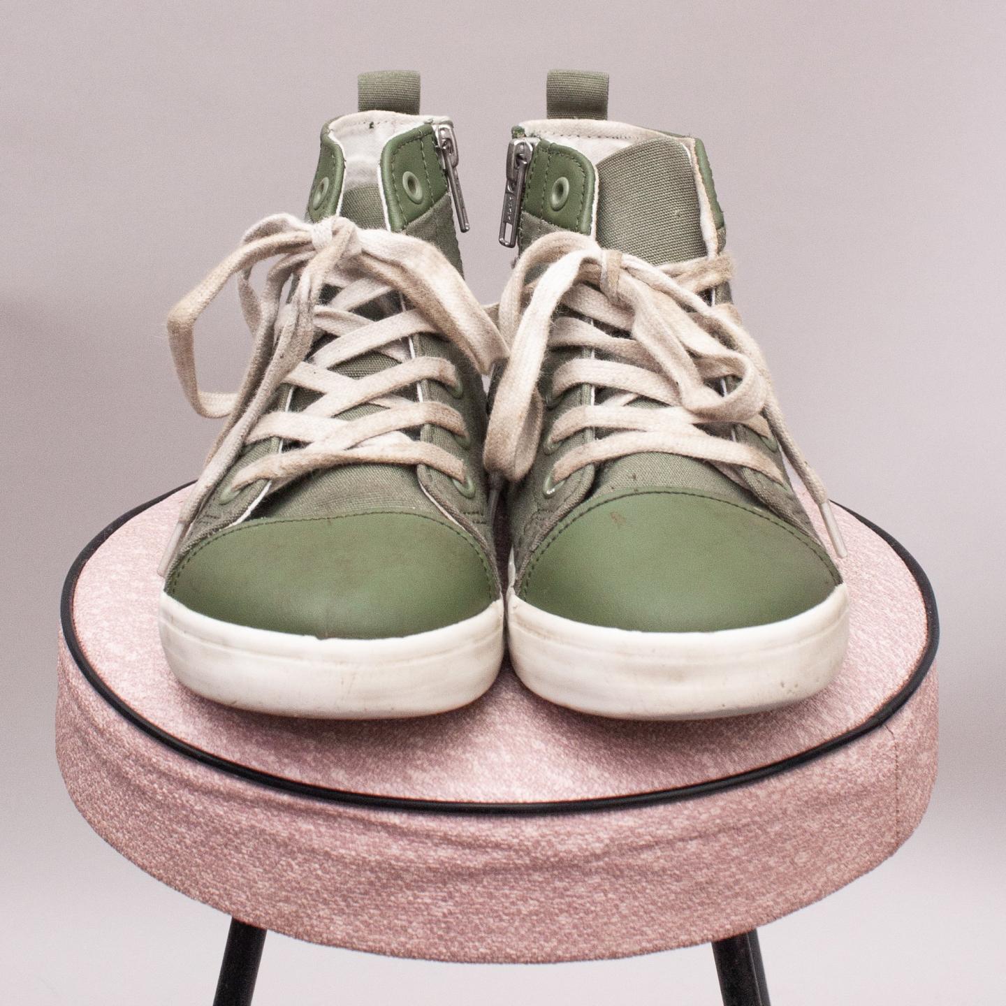 Country Road "in box" green canvas high tops with cream laces, side zip closure and sturdy rubber soles - Size EU 31 (Age 6 Approx.) *A few marks and some discolouration on laces