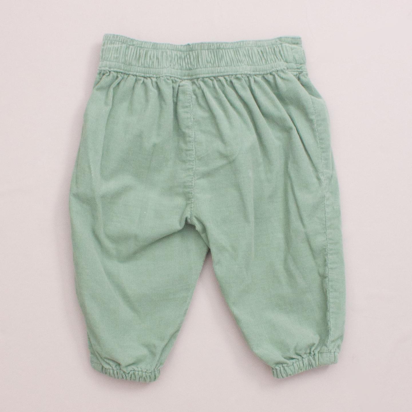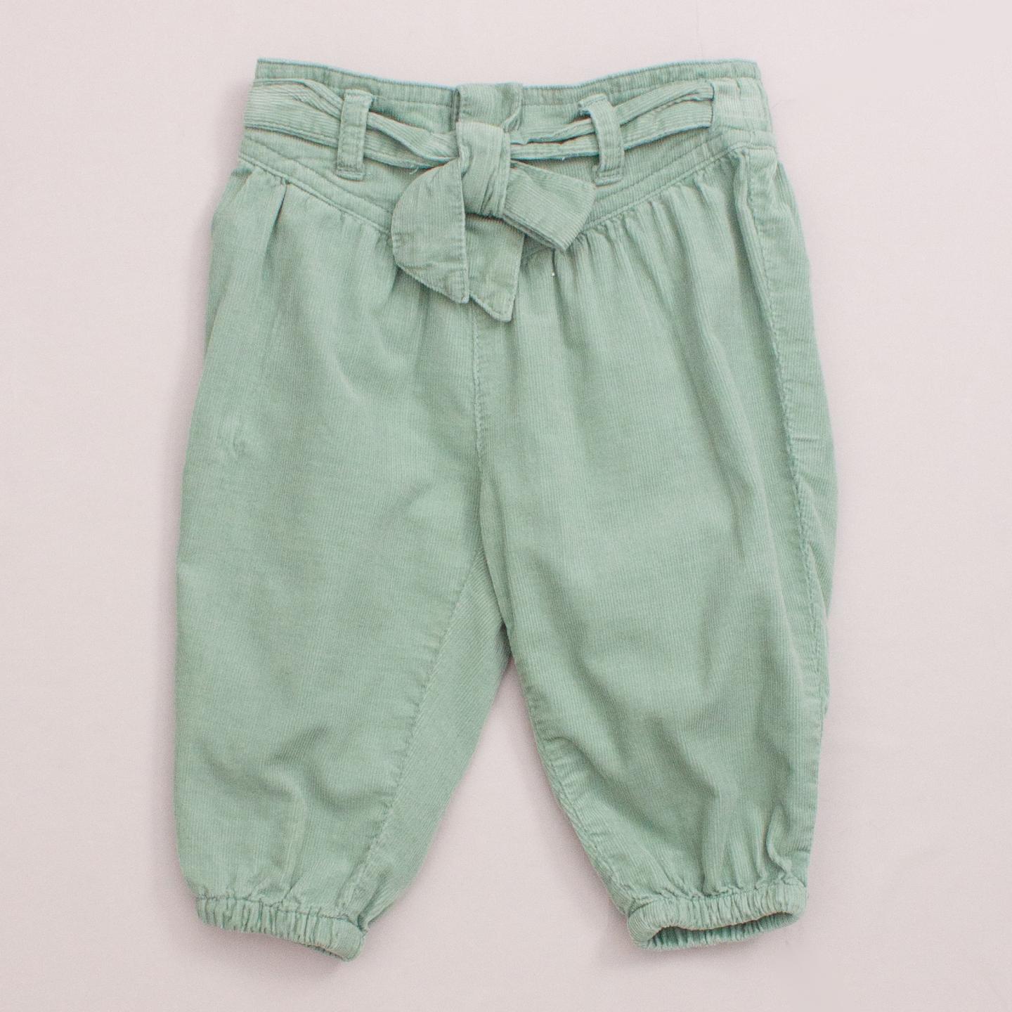 Country Road green corduroy pants elastic cuffs and waistband, belt loops and tie up front *100% Cotton
