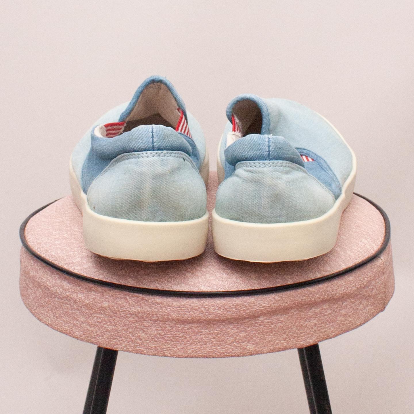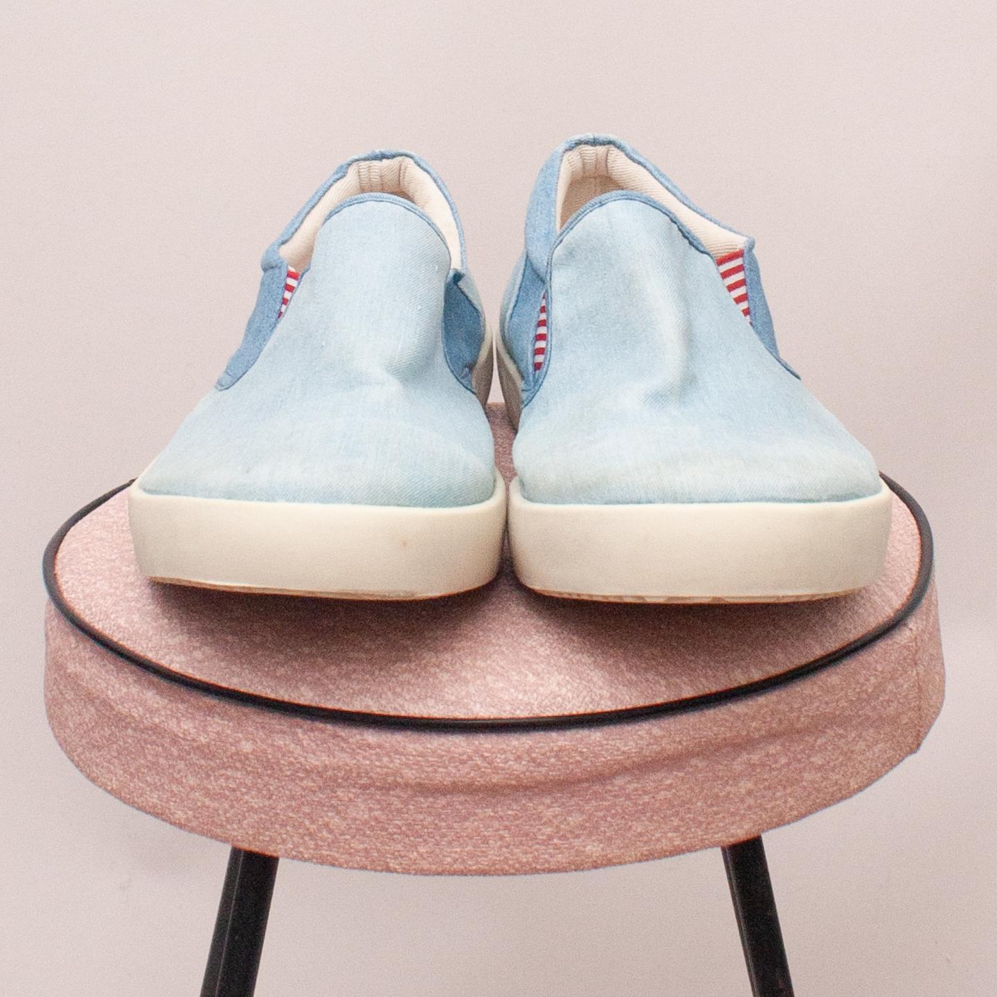 Country Road light blue denim slip on's with red and white striped detail and sturdy rubber soles - Size EU 36 (Age 8 approx.)