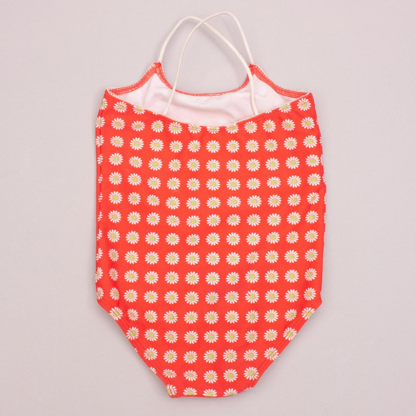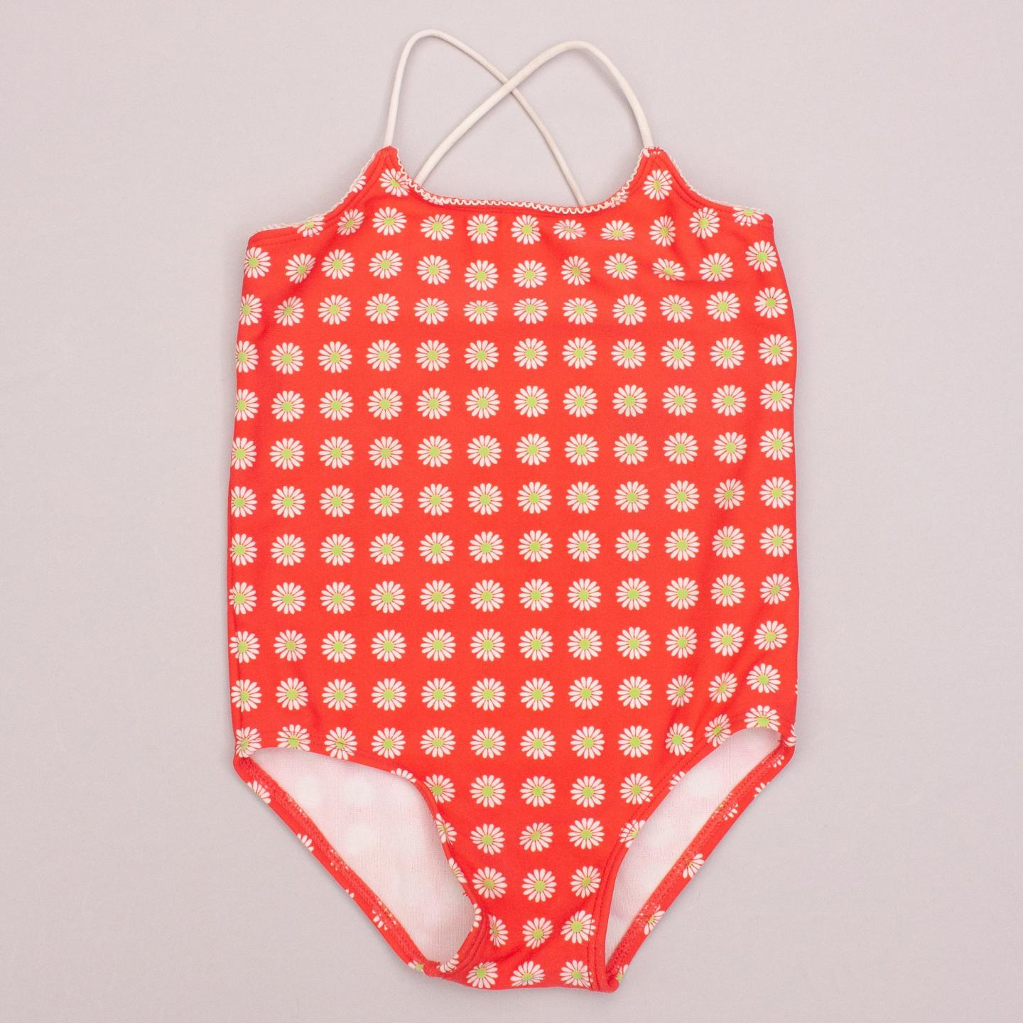 Country Road red bathers with flower pattern throughout, scalloped edging and cross-over straps