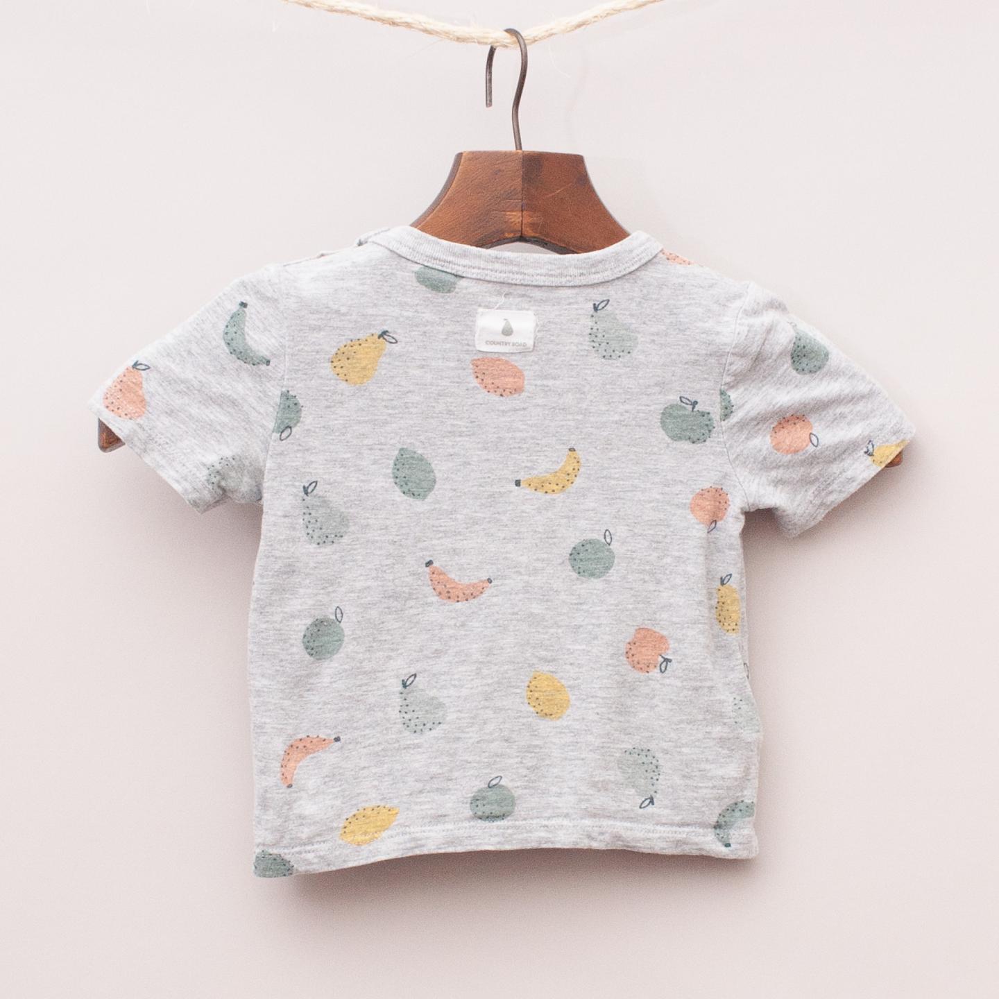 Country Road grey t-shirt with fruit printed throughout and snap button shoulder closure *100% Cotton