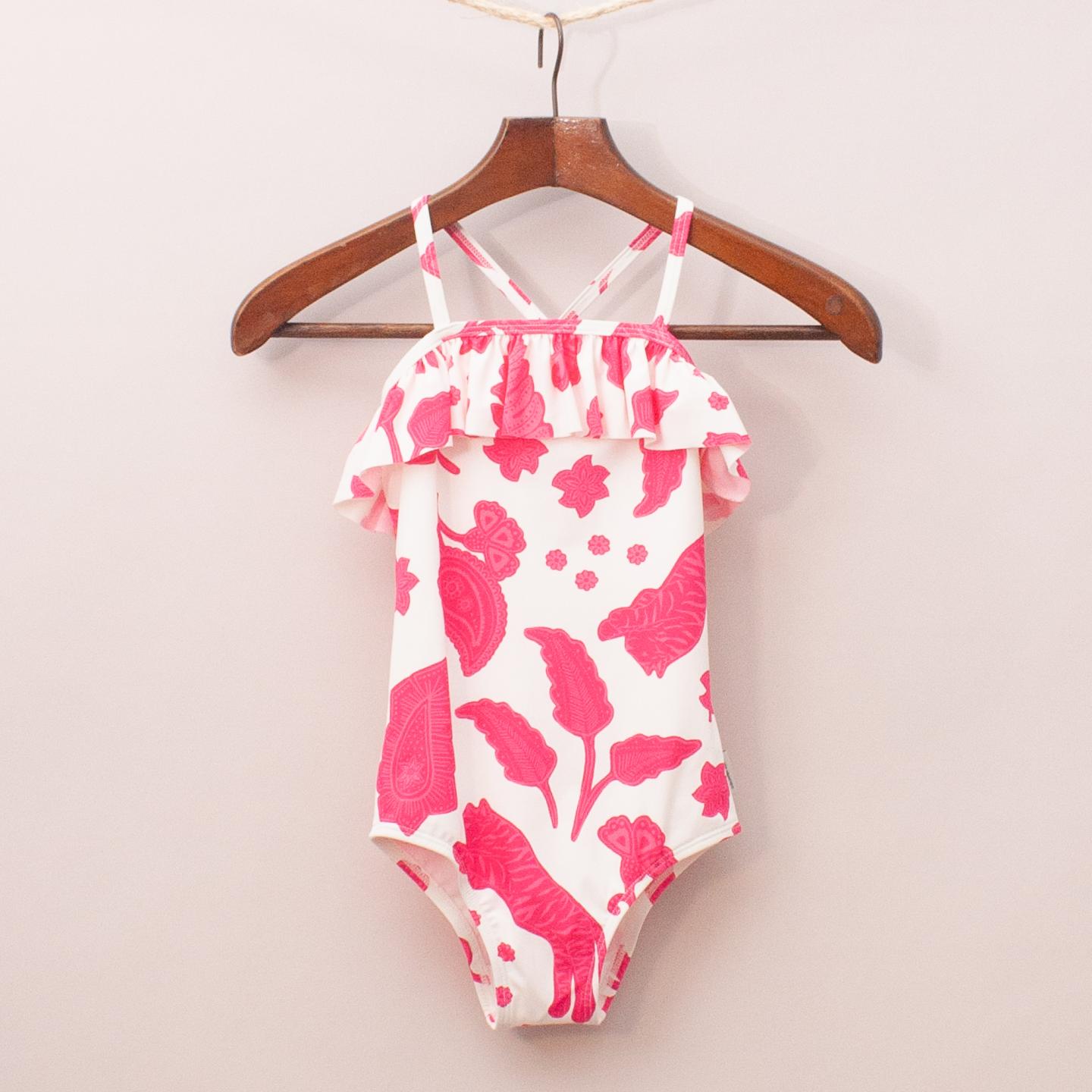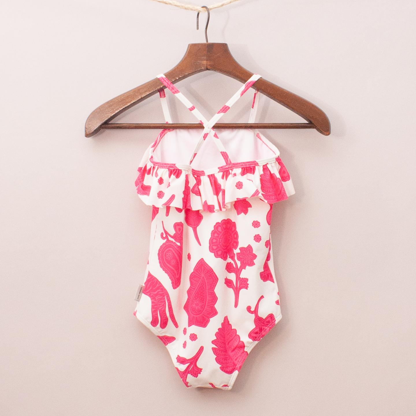 Country Road "brand new with tags" white and bright pink paisley patterned bathers with ruffle neckline and cross-over back *73% Nylon, 27% Elastane