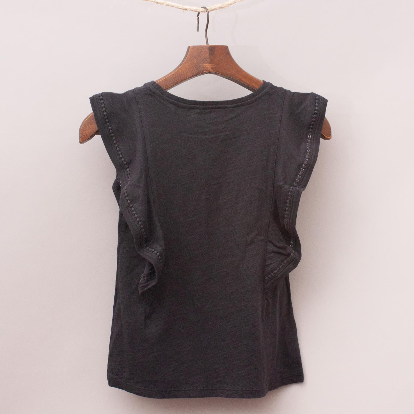 Country Road charcoal top with ruffle sleeves, detailed trim and gathered neckline *100% Cotton
