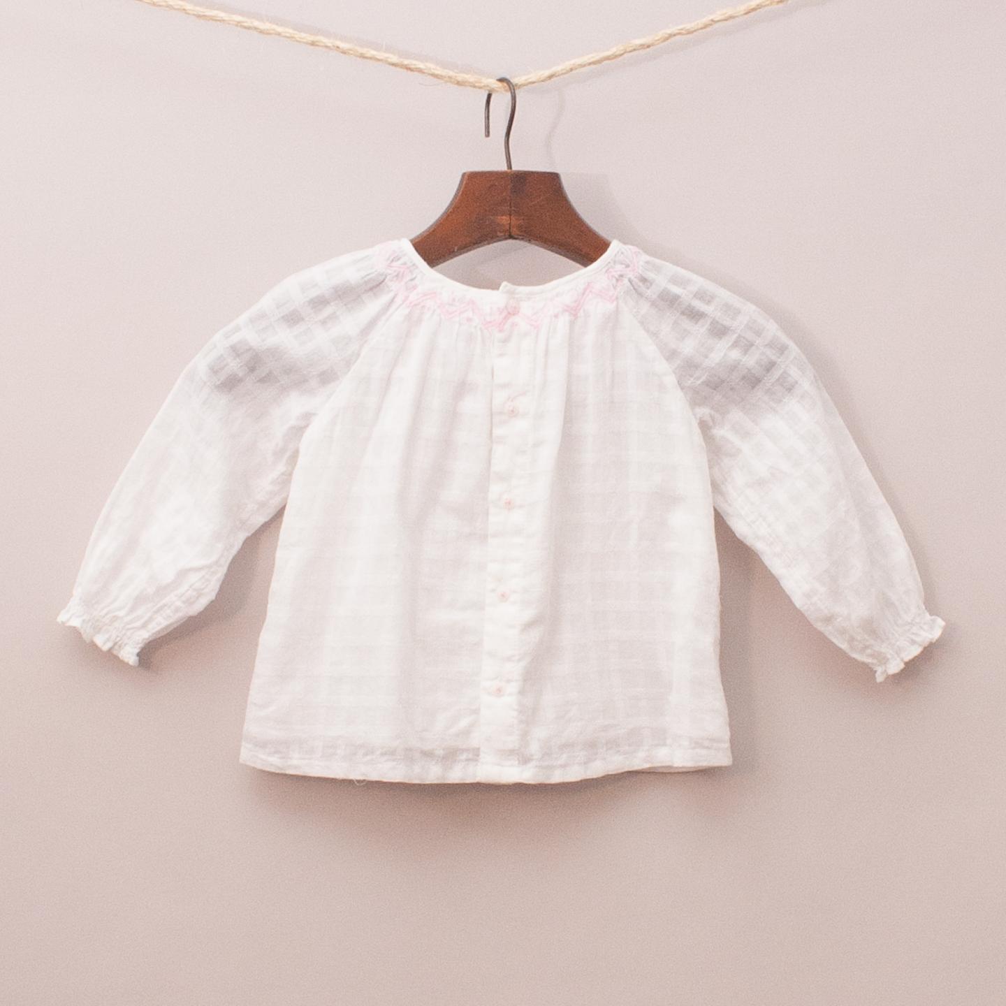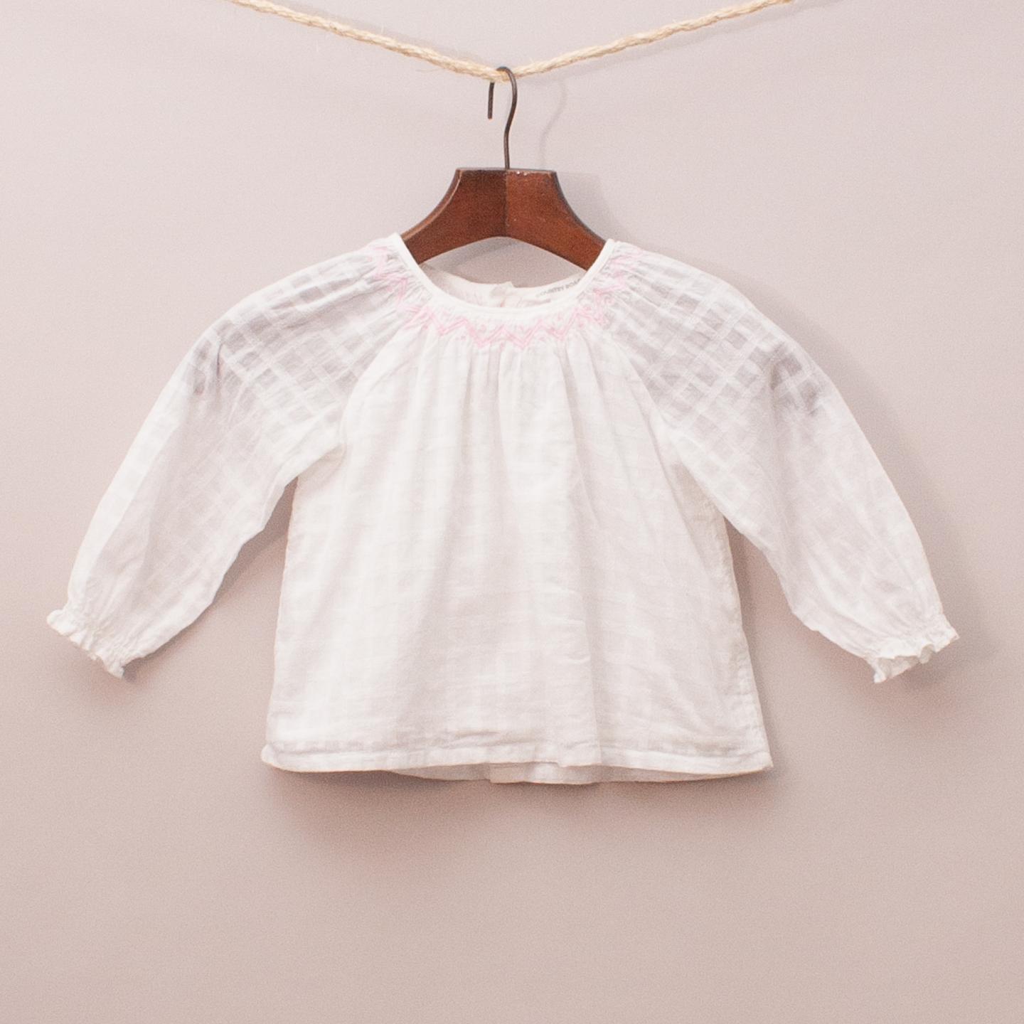 Country Road white sheer blouse, fully lined with pastel pink embroidered neckline and full button down back *100% Cotton