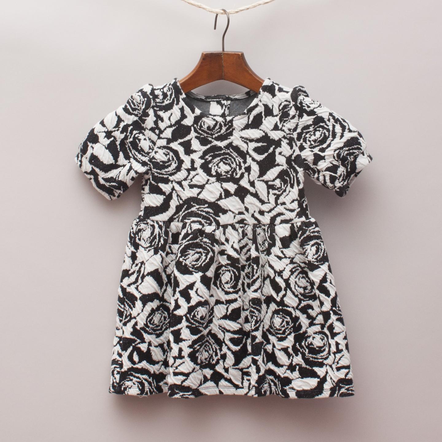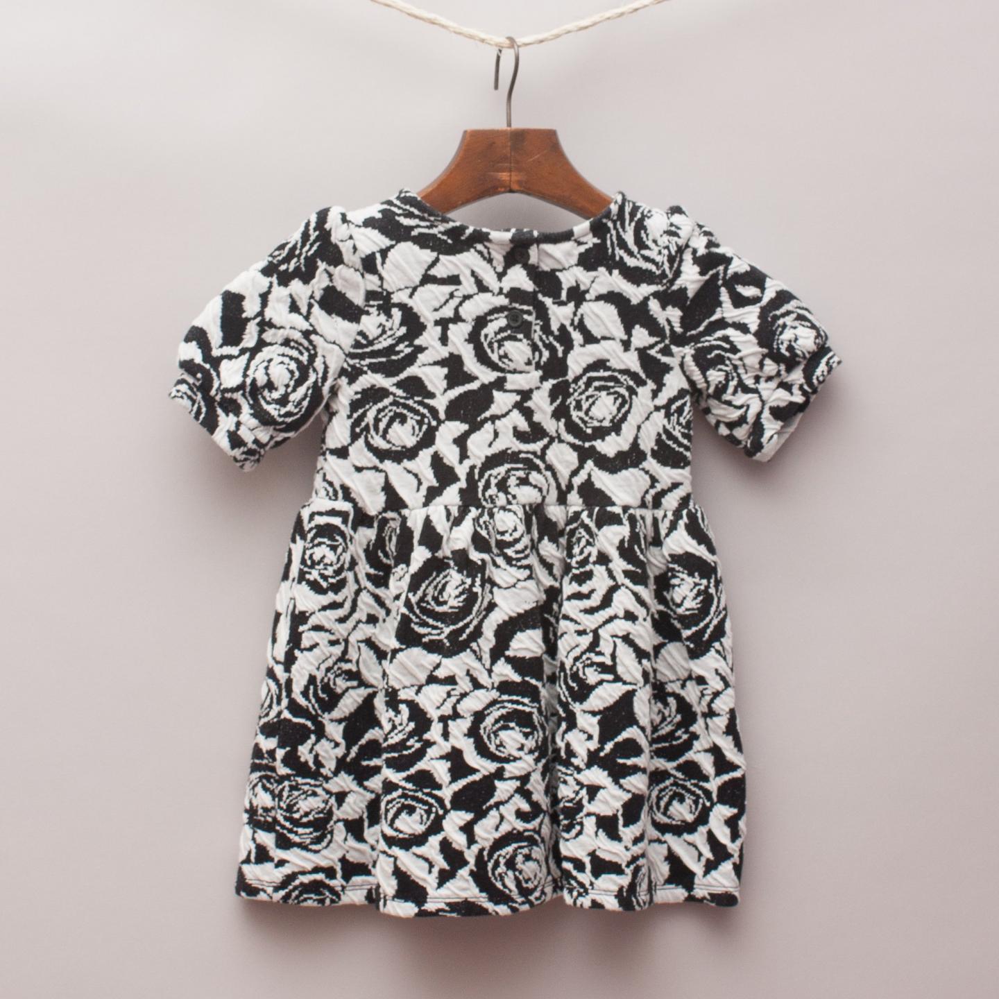 Crazy8 monochrome floral print stretch t-shirt dress with fitted bodice, puffed sleeves and two button up back closure