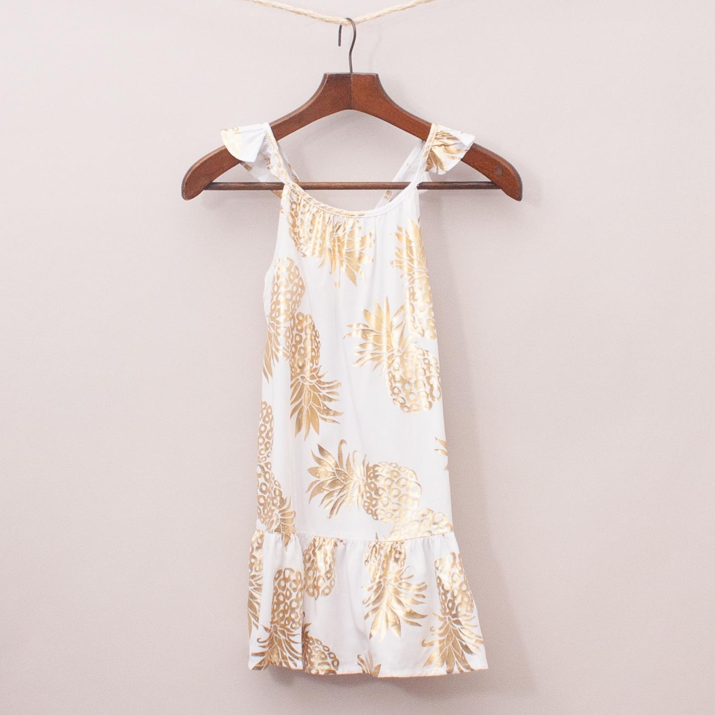 Crazy8 "brand new with tags" white sun dress with gold pineapple pattern throughout and ruffle sleeves and hemline *100% Rayon