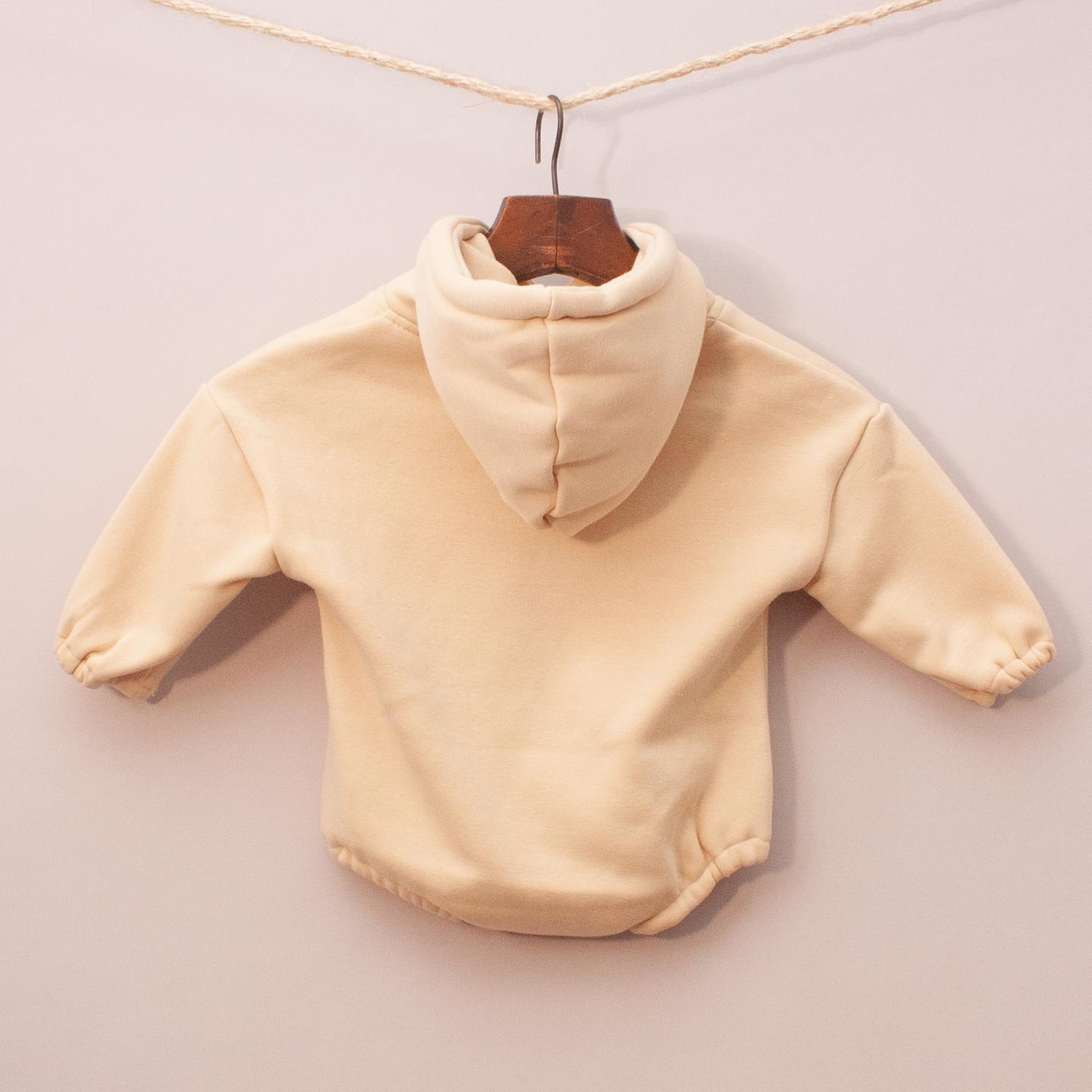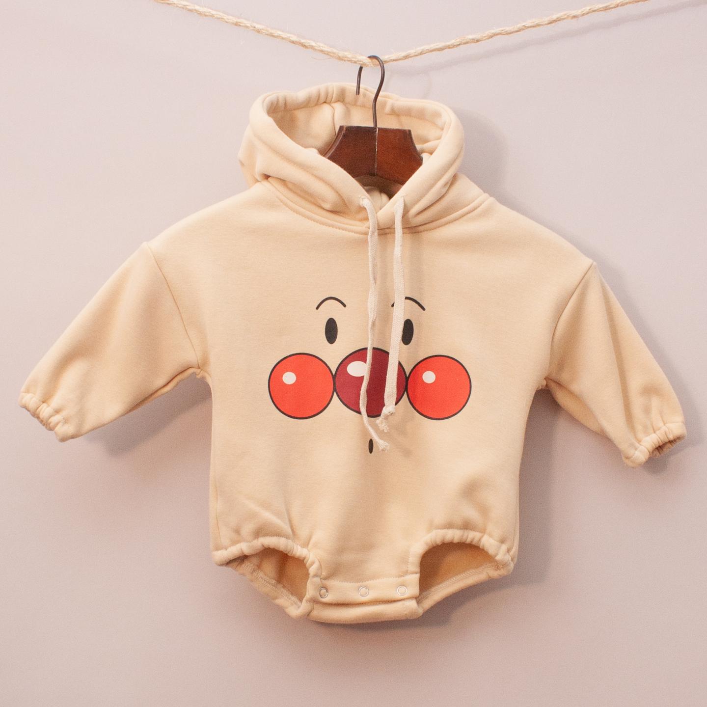 Cream coloured hooded romper with long sleeves and printed face on the front