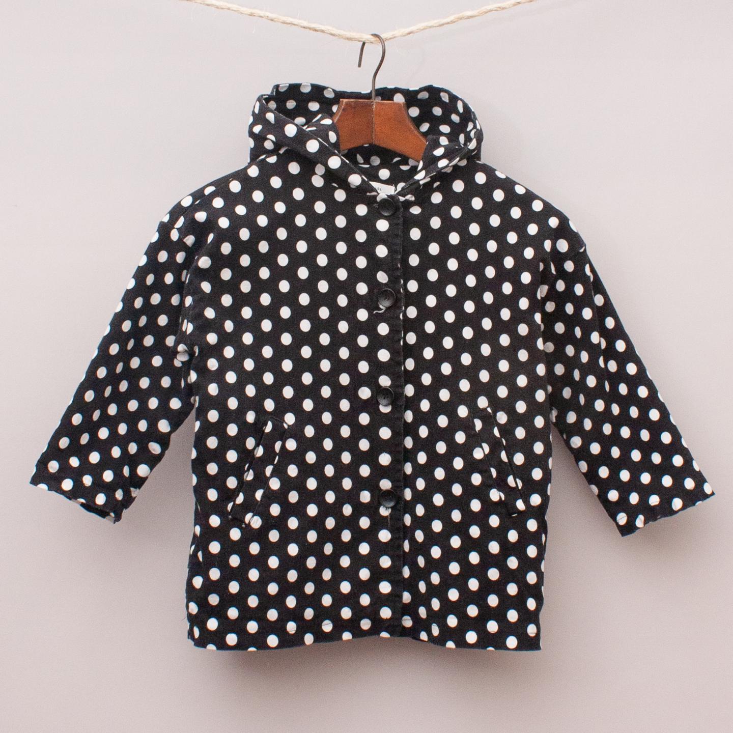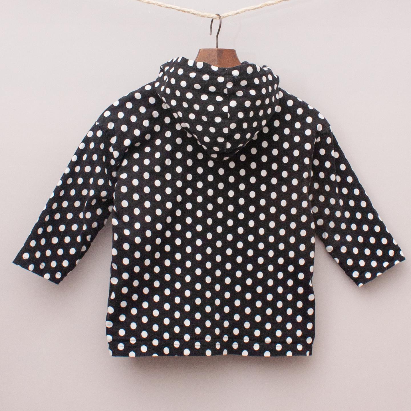 Cream Kids black and white polka dot lightweight jacket with hood, two front pockets and full button down front