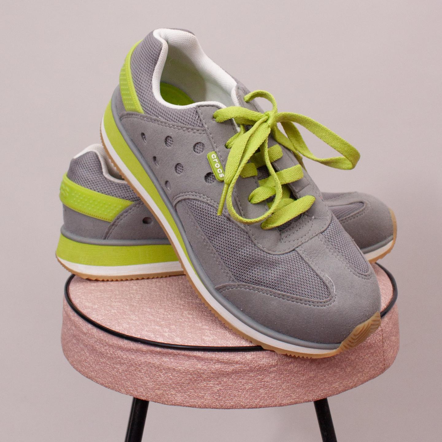 Crocs grey and bright green sneakers with green laces and sturdy rubber soles - Size US Junior 4 (Age 8 Approx.) *Small mark on the side