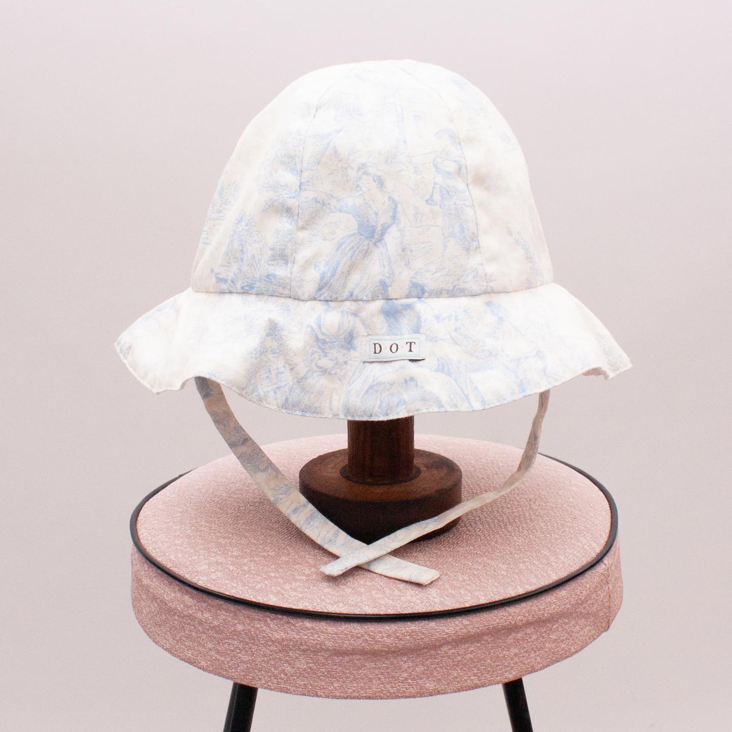 D.O.T cream and blue patterned sun hat and under chin tie and ruffle edge - Size 49cm approx.