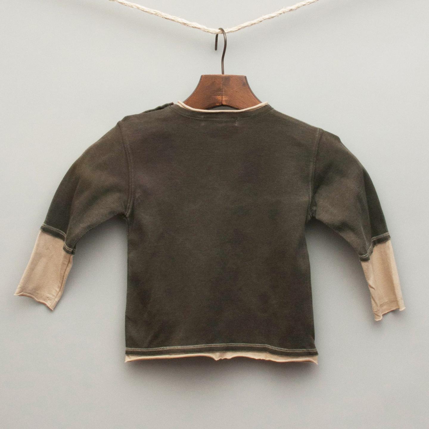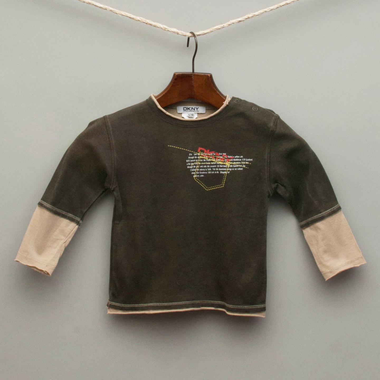 DKNY charcoal and cream long sleeve top with layered look, printed writing on front and shoulder button detail