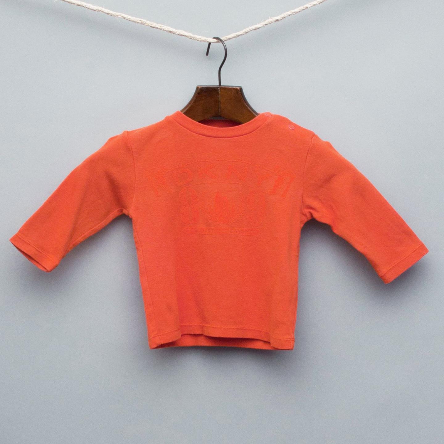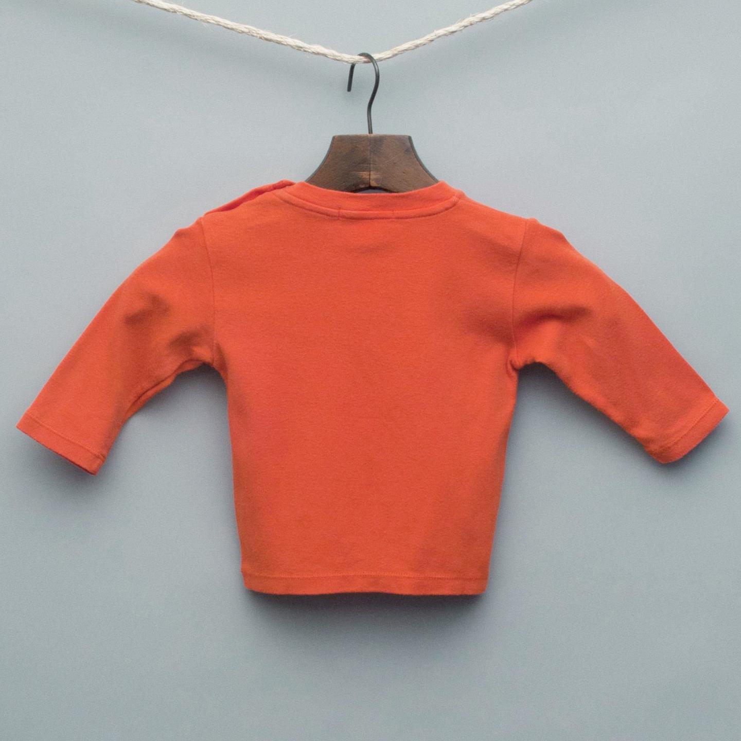 DKNY orange long sleeve top with printed banner logo on front and button shoulder fastening