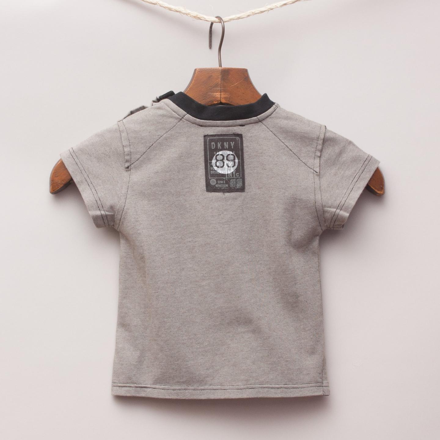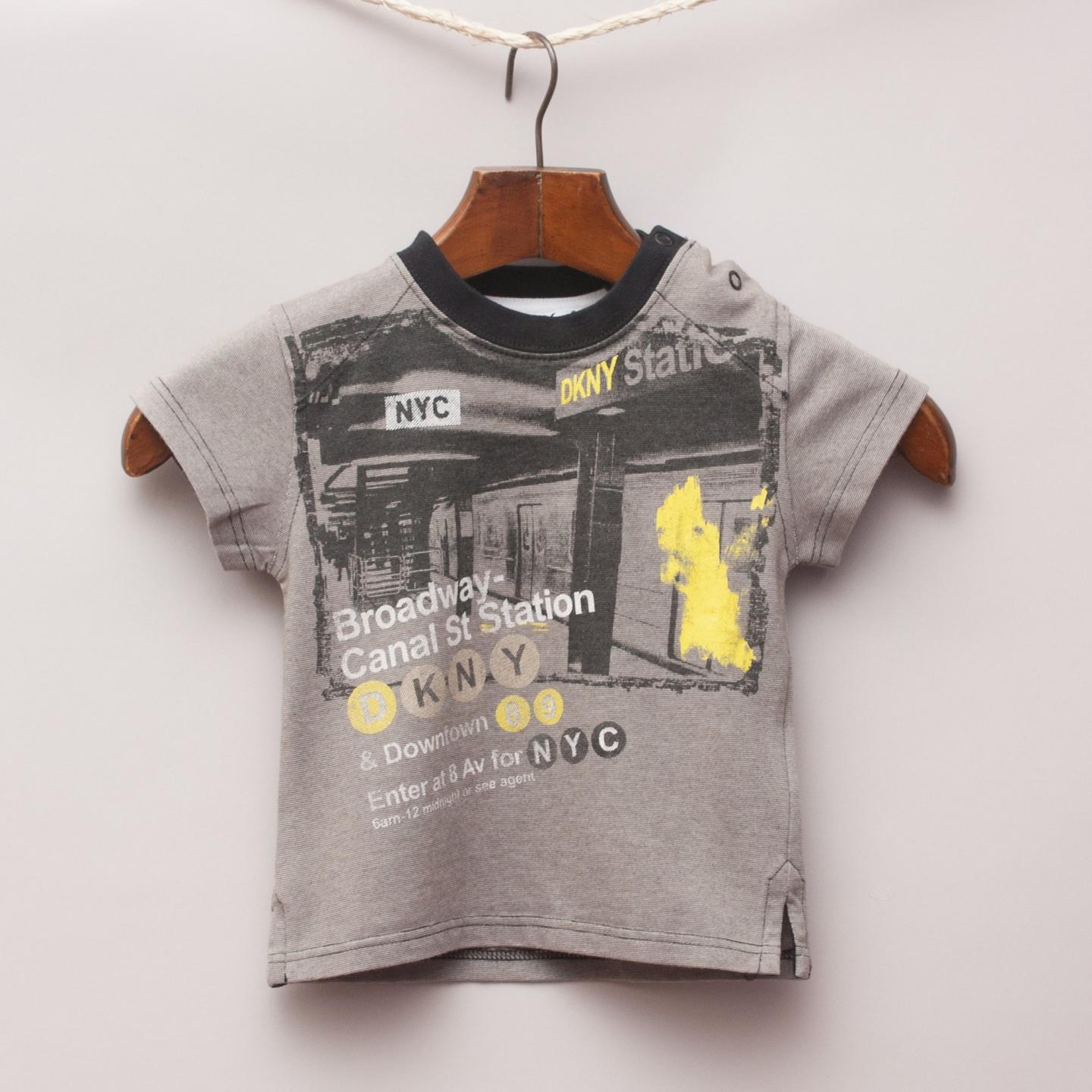 DKNY grey t-shirt with New York City subway image on the front and shoulder button detail
