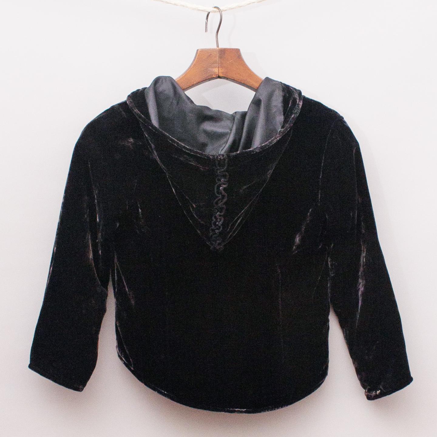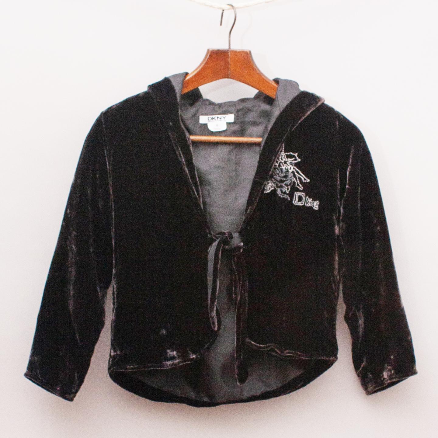 DKNY dark navy blue velvet soft jacket with hood, tie front and embroidered logo on the front