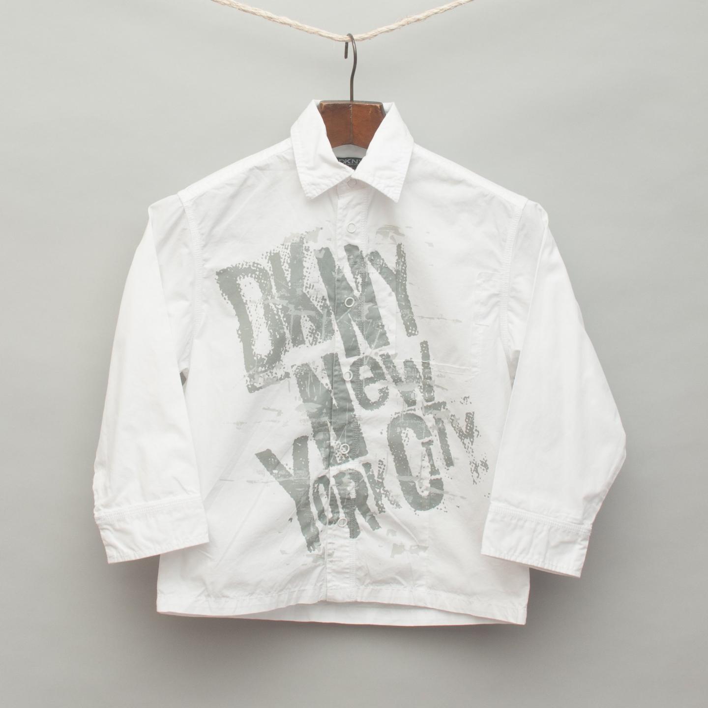 DKNY white shirt with printed writing on front in grey and press stud buttons
