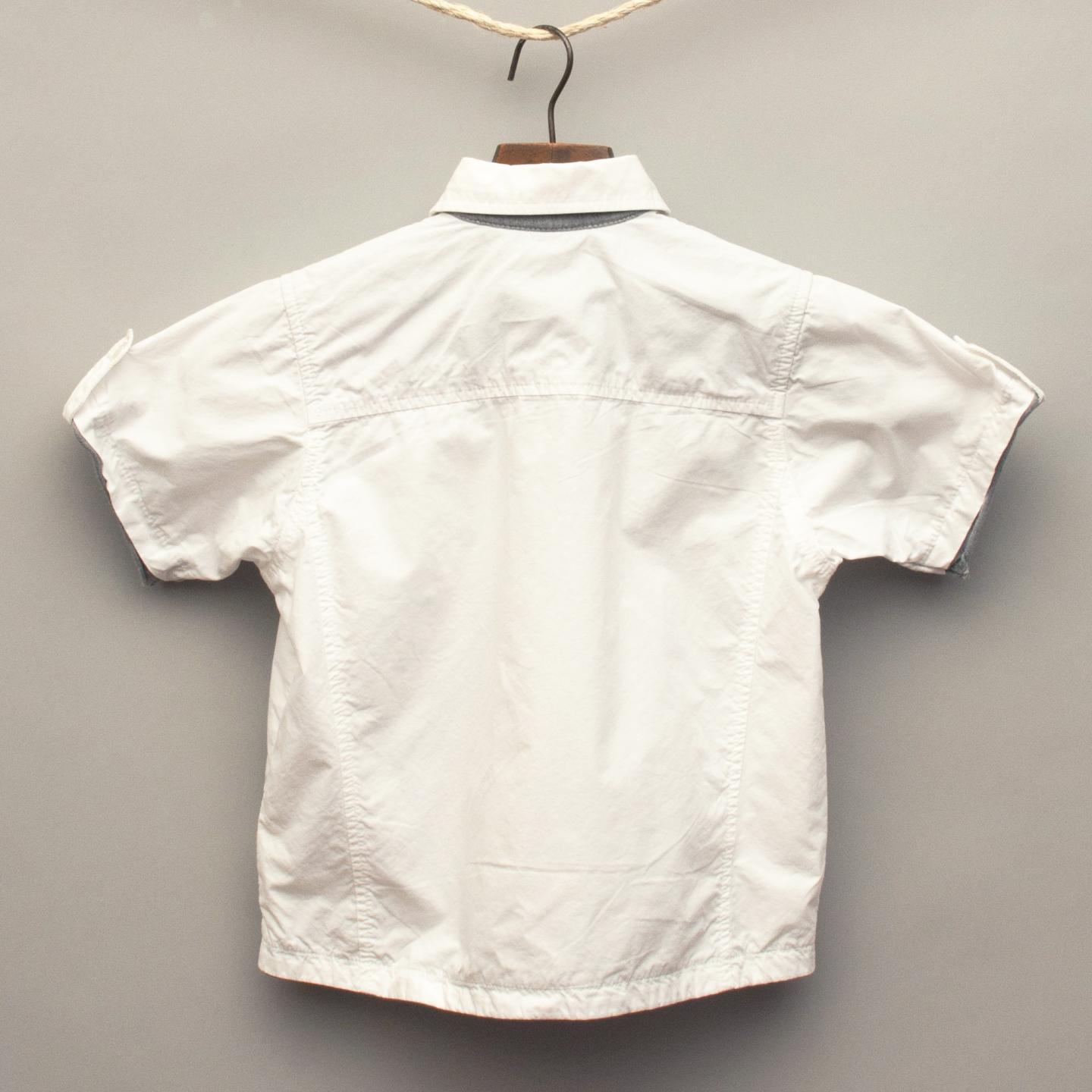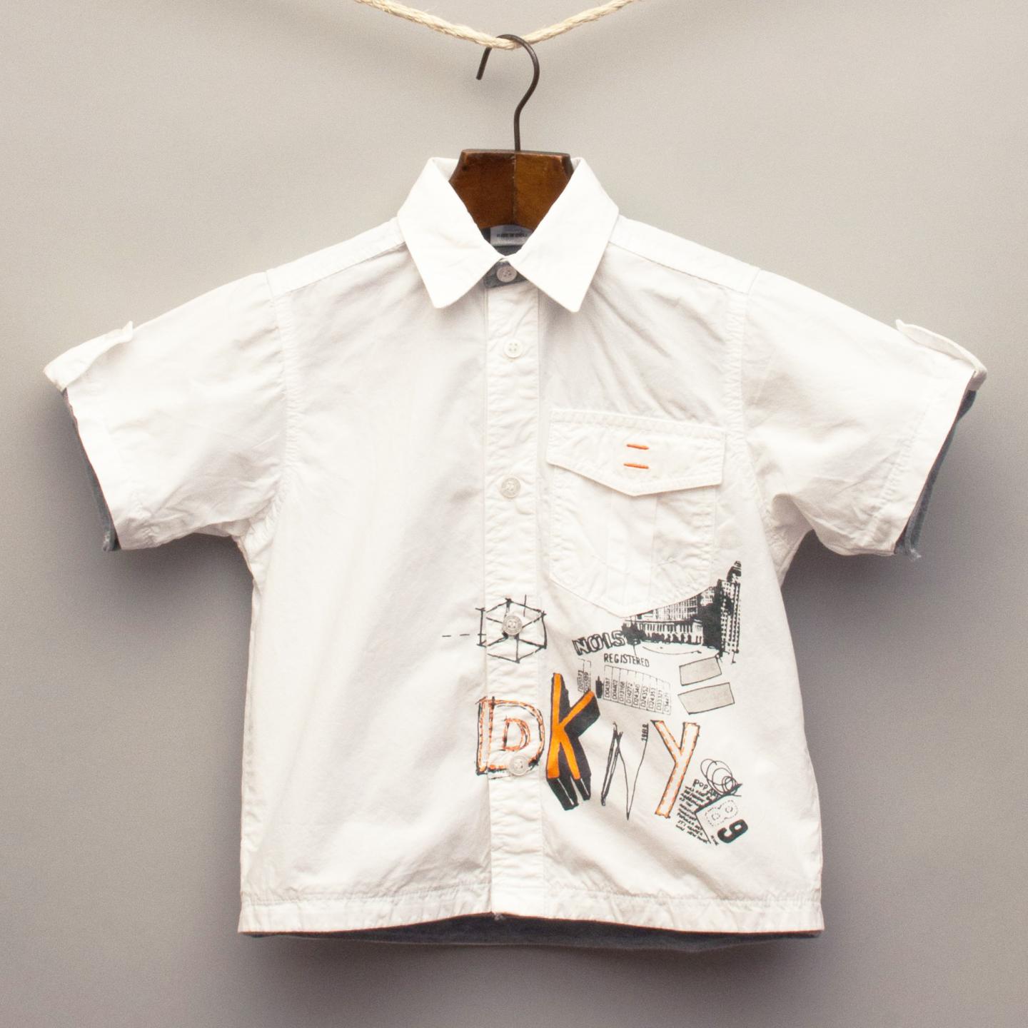 DKNY white shirt with orange stitching detail, printed writing on front and layered t-shirt look underneath