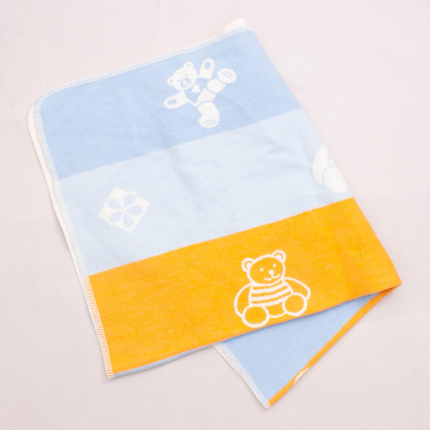 David Fussenegger blue, white and yellow felt-like baby blanket with bear pattern throughout - Size 67cm x 80cm