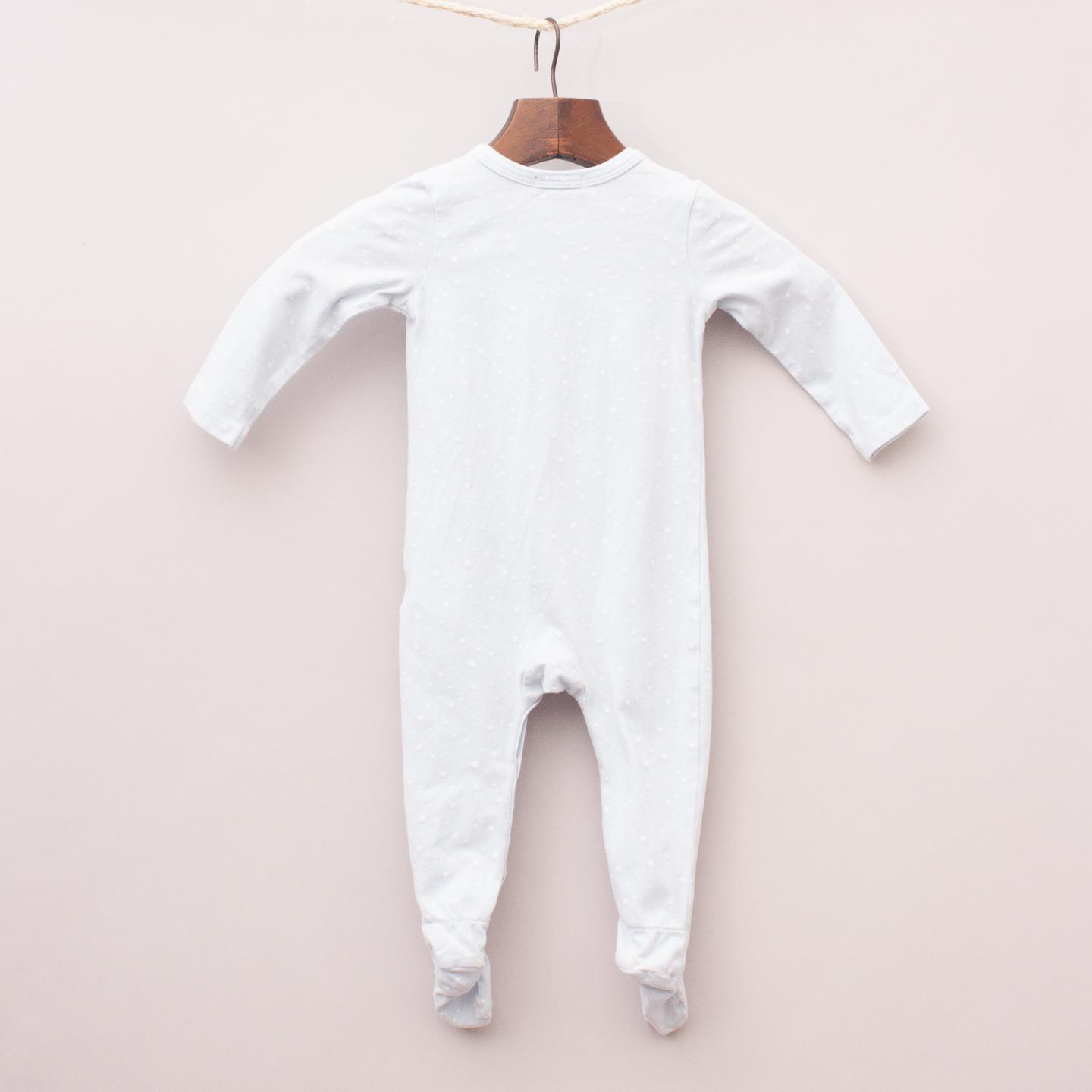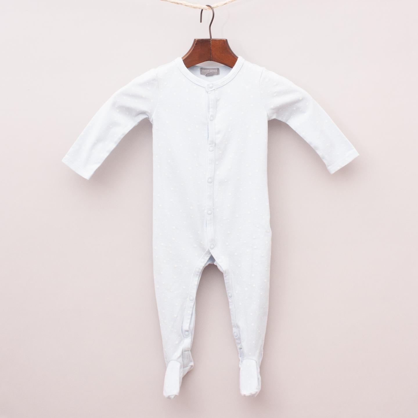 David Jones pastel blue long sleeve romper with white stars printed throughout, built in booties and full button down front *Cotton/Elastane Blend