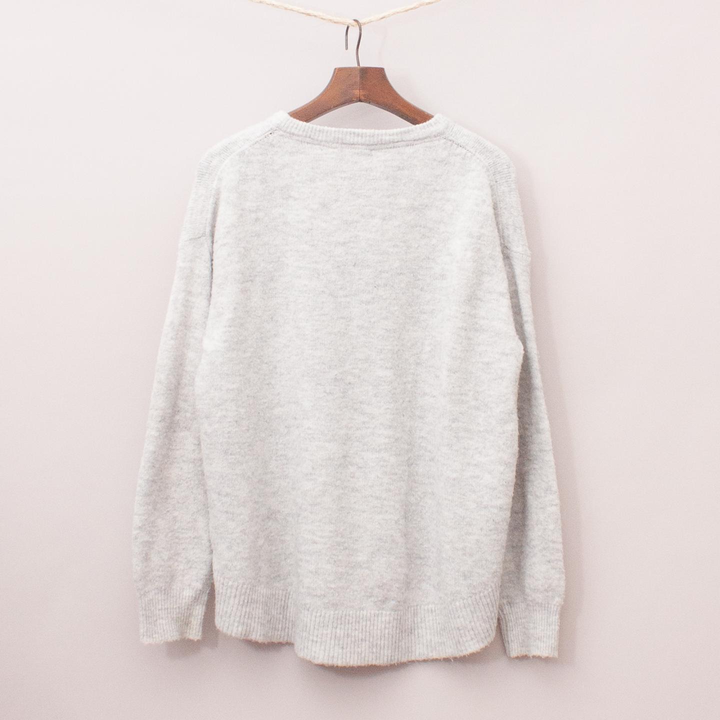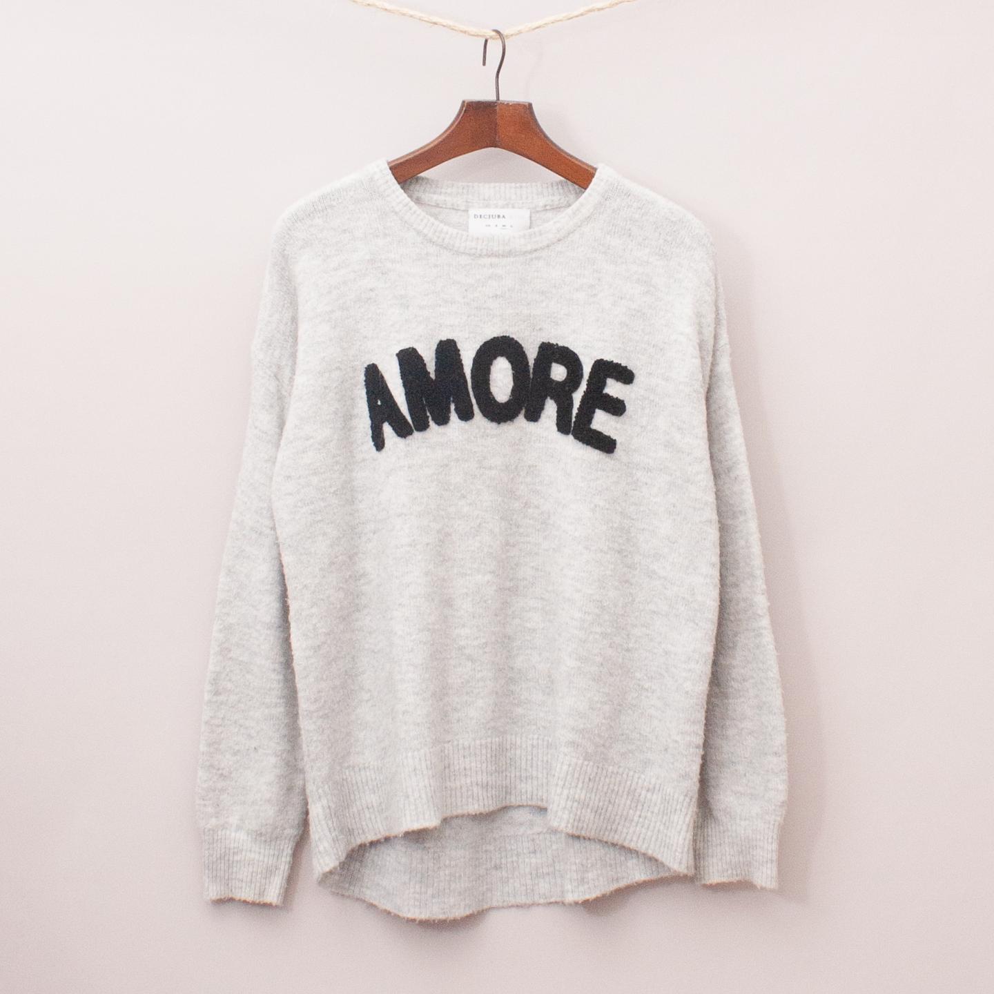 Decjuba grey marle jumper with 'Amore' across the front and high/low hemline - Some pilling throughout *75% Acrylic, 22% Polyester, 3% Elastane