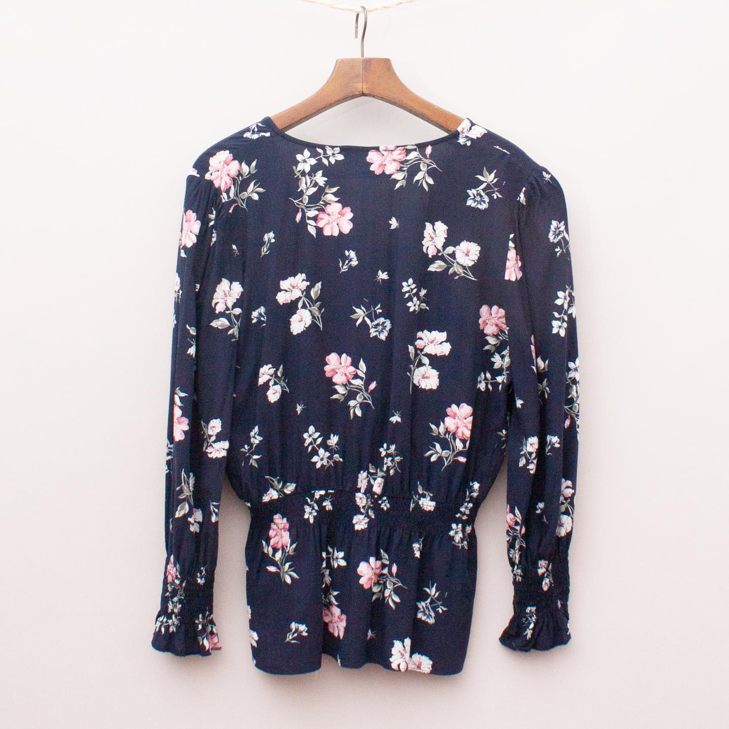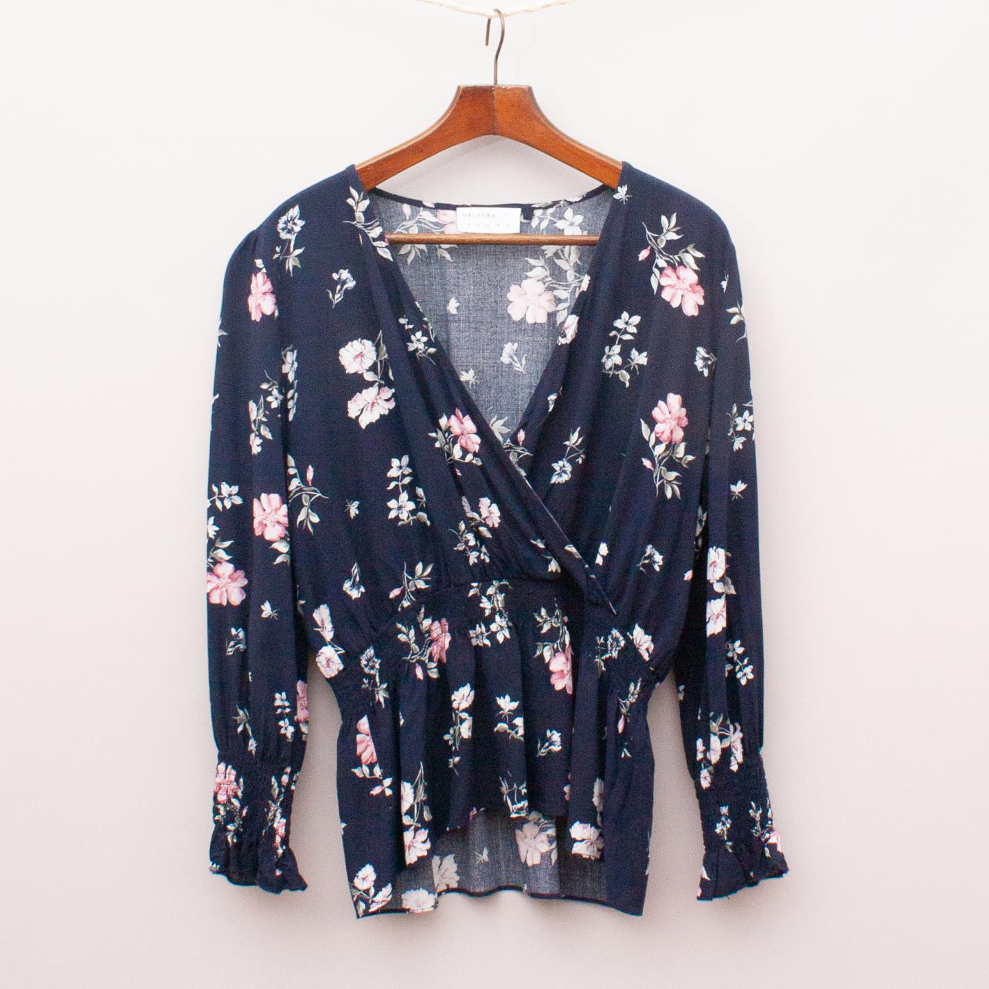 Decjuba navy blue floaty blouse with floral pattern throughout, deep v-neckline with cross-over style and elastic waistband with ruffle hemline