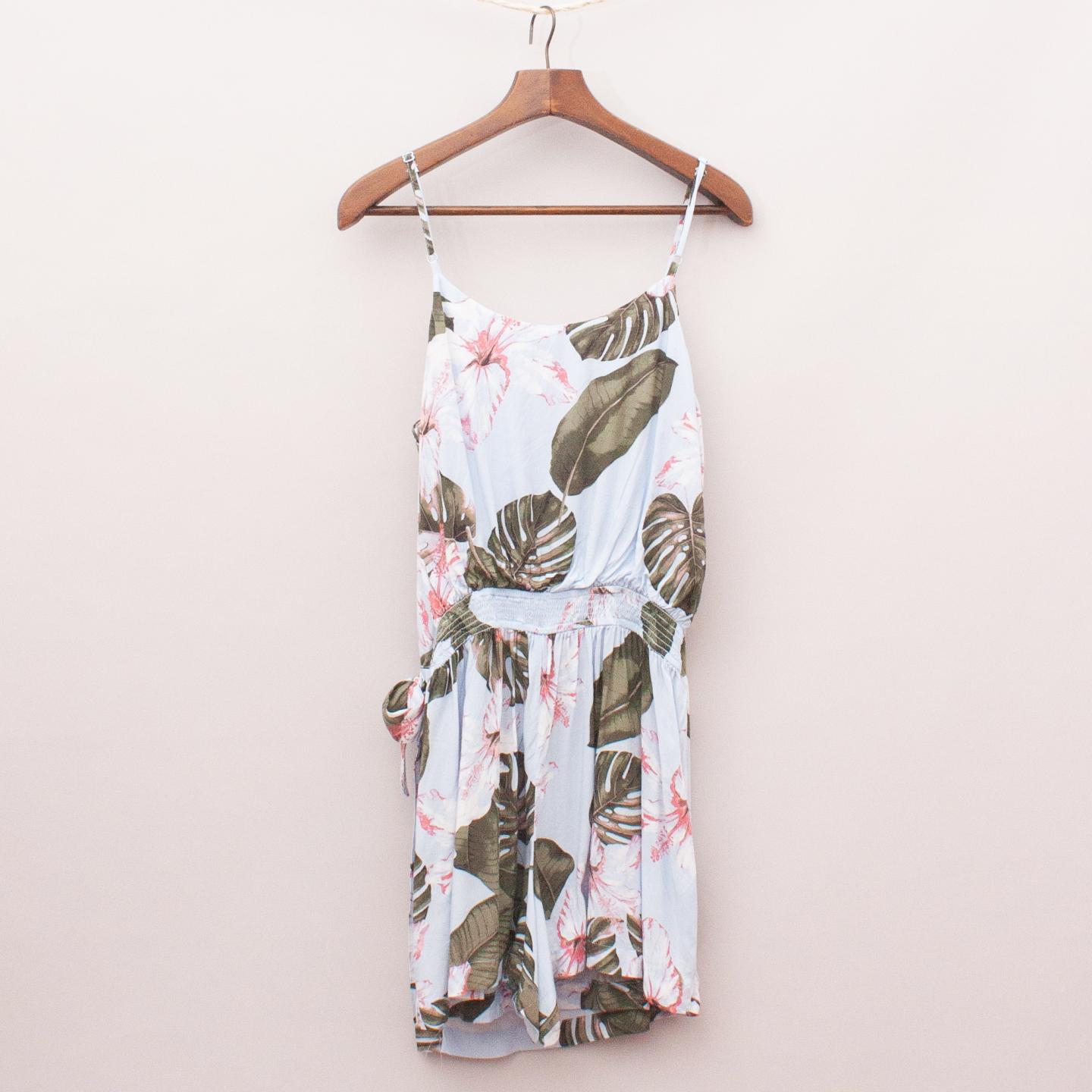 Decjuba pastel blue and floral patterned playsuit with skirt front, elastic waistband and tie with adjustable straps