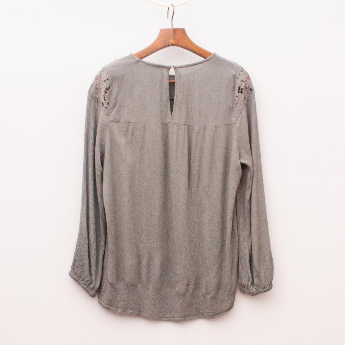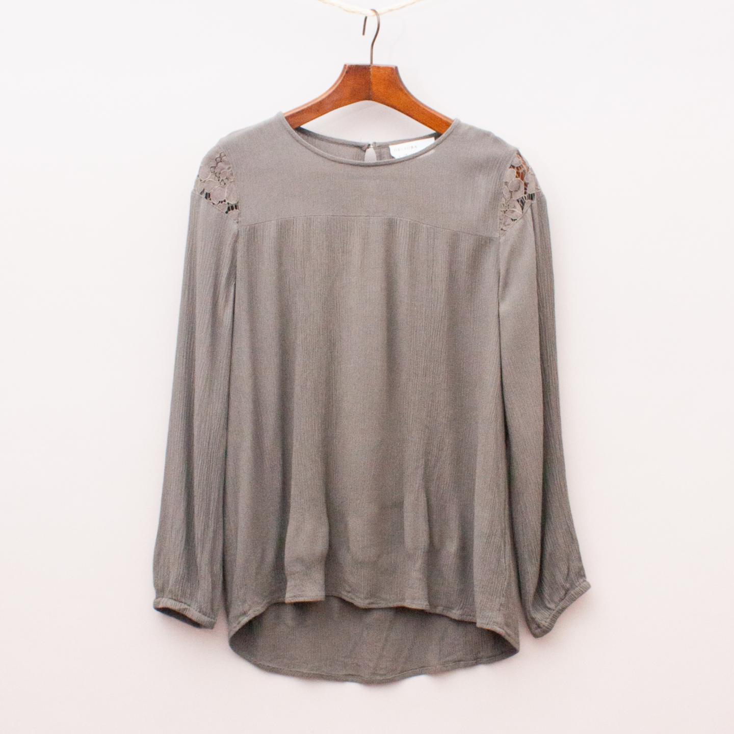 Decjuba khaki long sleeve lightweight blouse with lace shoulder details, high/low hemline and single button back closure