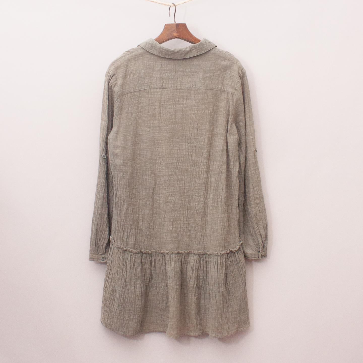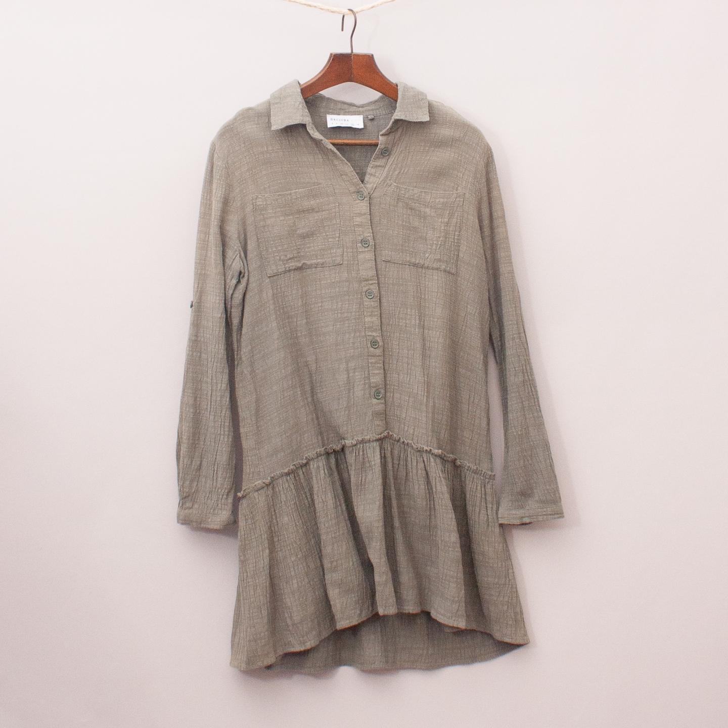 Decjuba kahki shirt dress with ruffle skirt, two front pockets and full button down front *59% Viscose, 41% Cotton