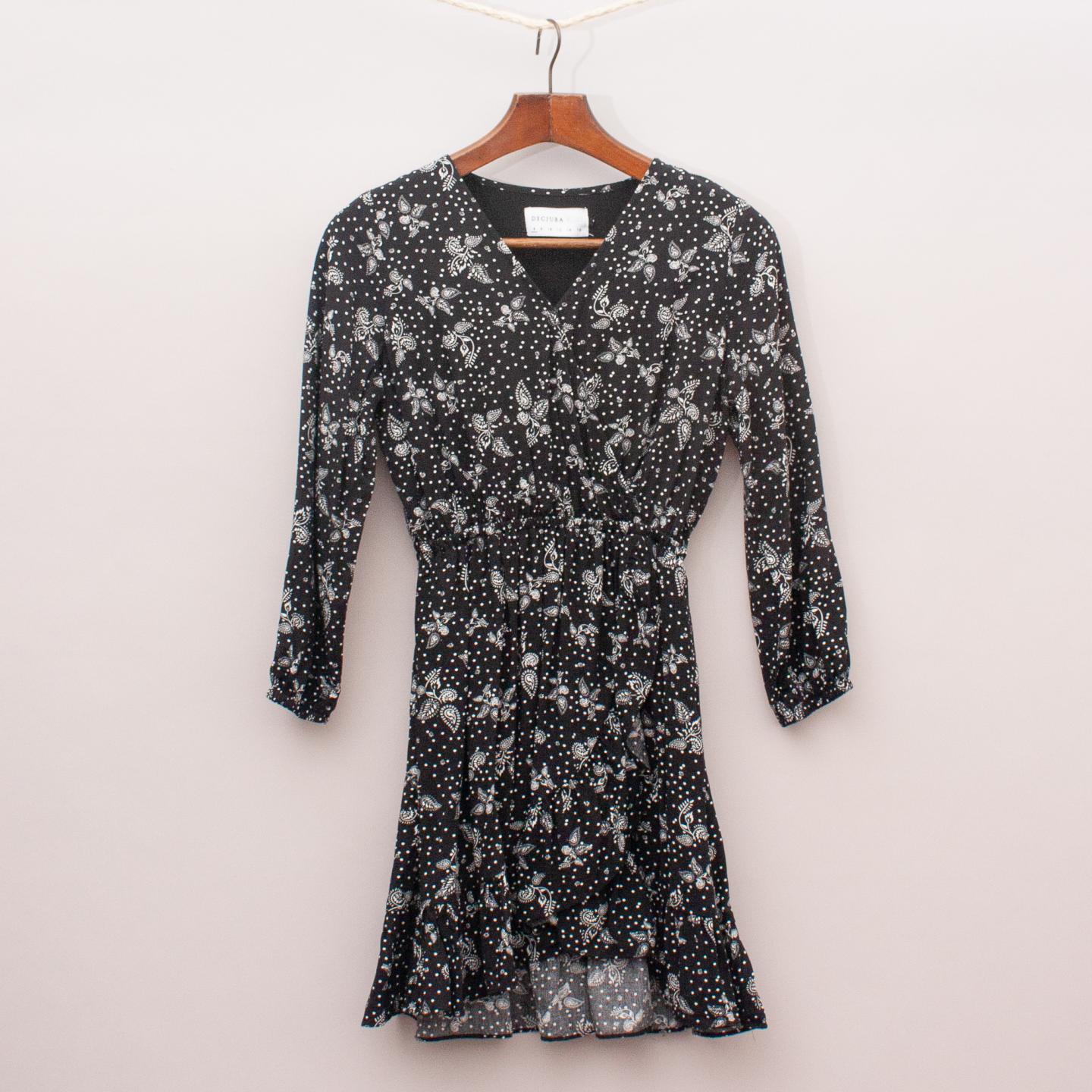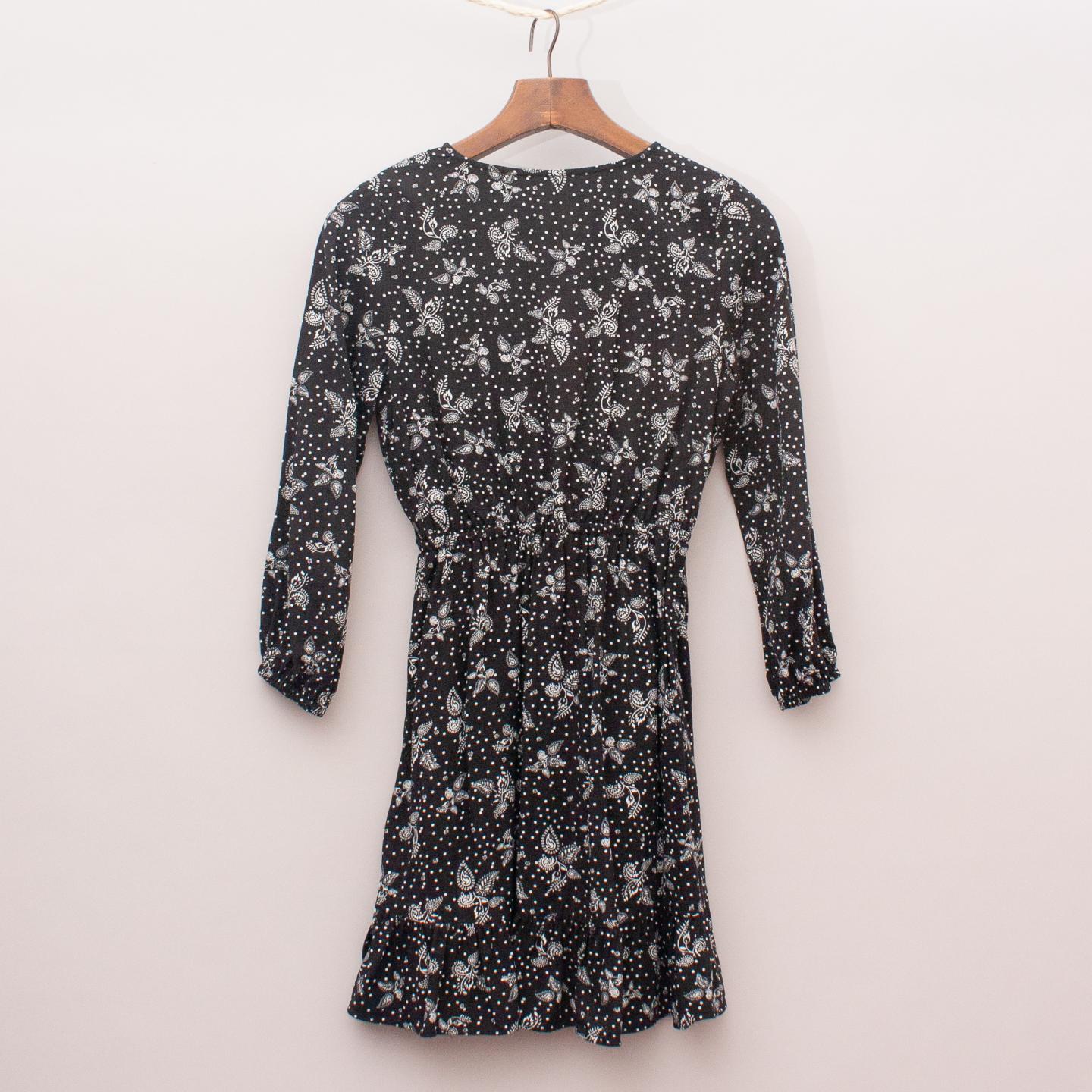 Decjuba black and white paisley patterned cross-over dress with ruffled hemline and elastic waistband