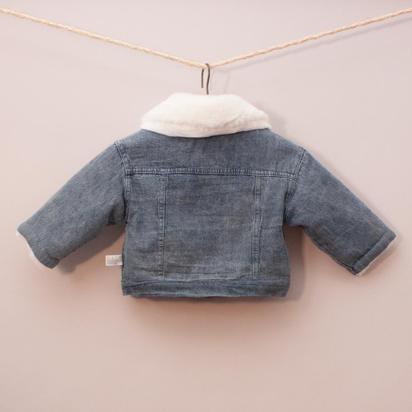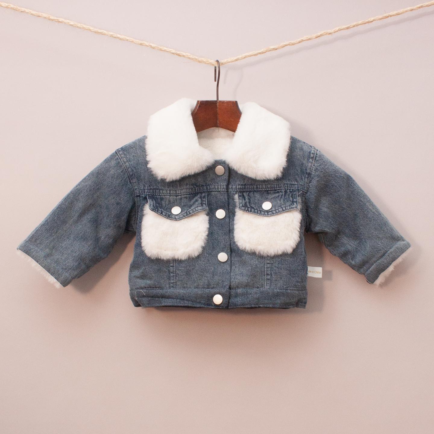 Denim and white faux fur jacket with two front pockets and button down front