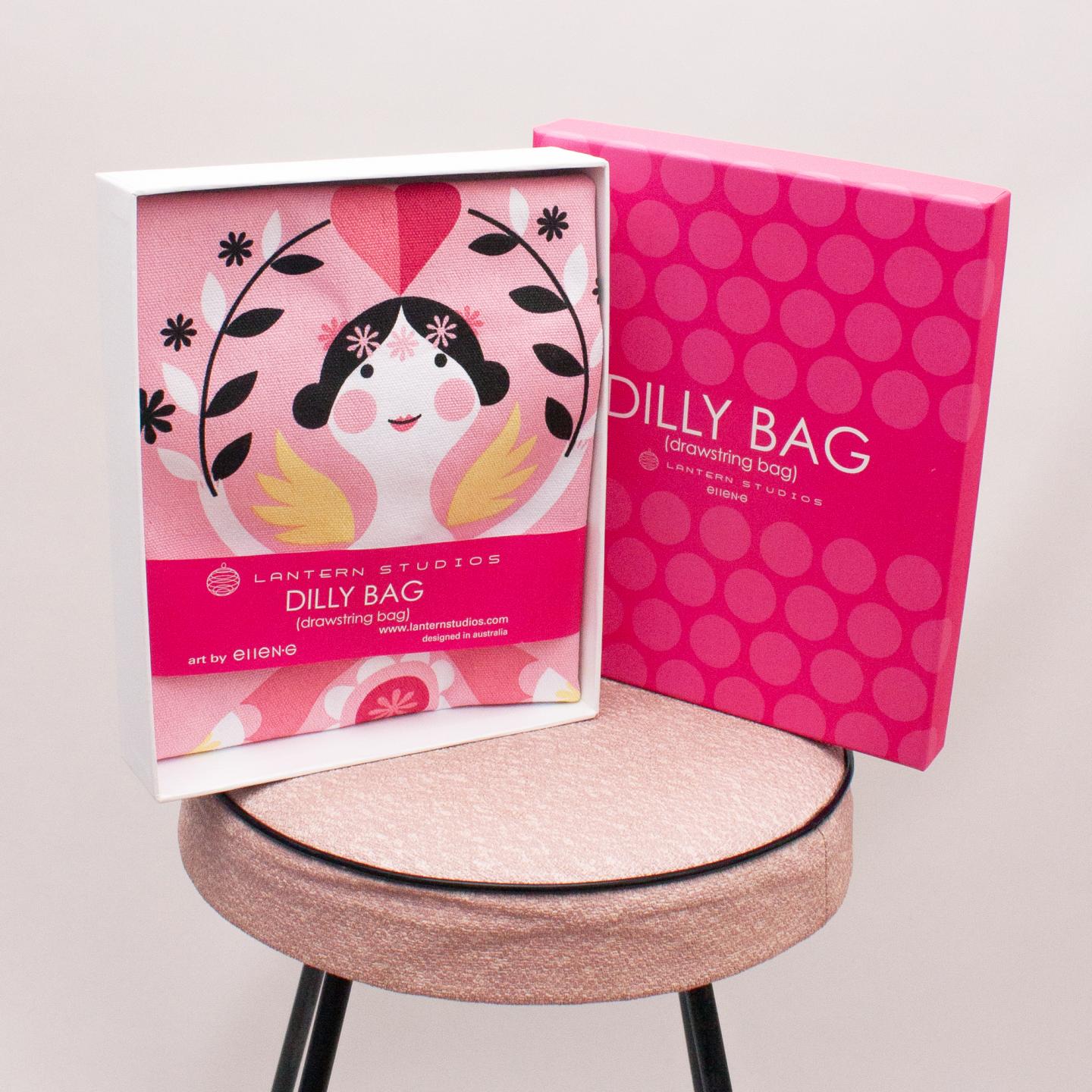 Dilly Bag pink and patterned ballerina drawstring bag *Comes packaged new in box