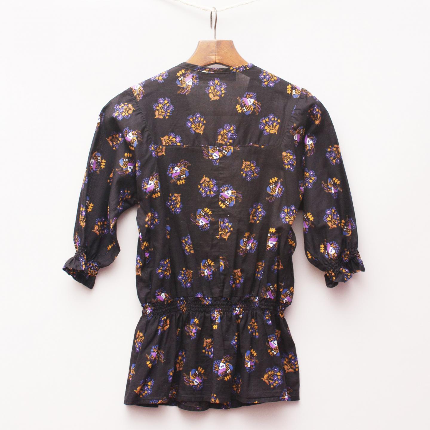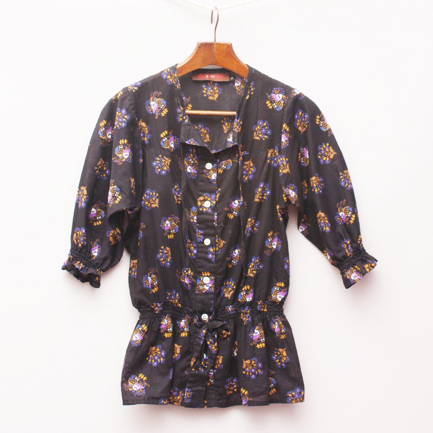 Dot & Herbey black peasant style blouse with gathered elastic waistband, drawstring, loose sleeves and full button down front