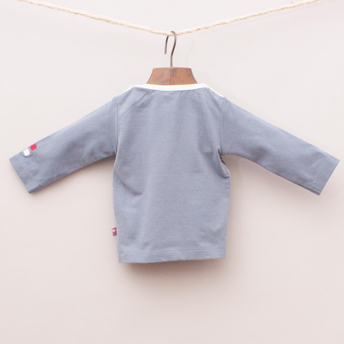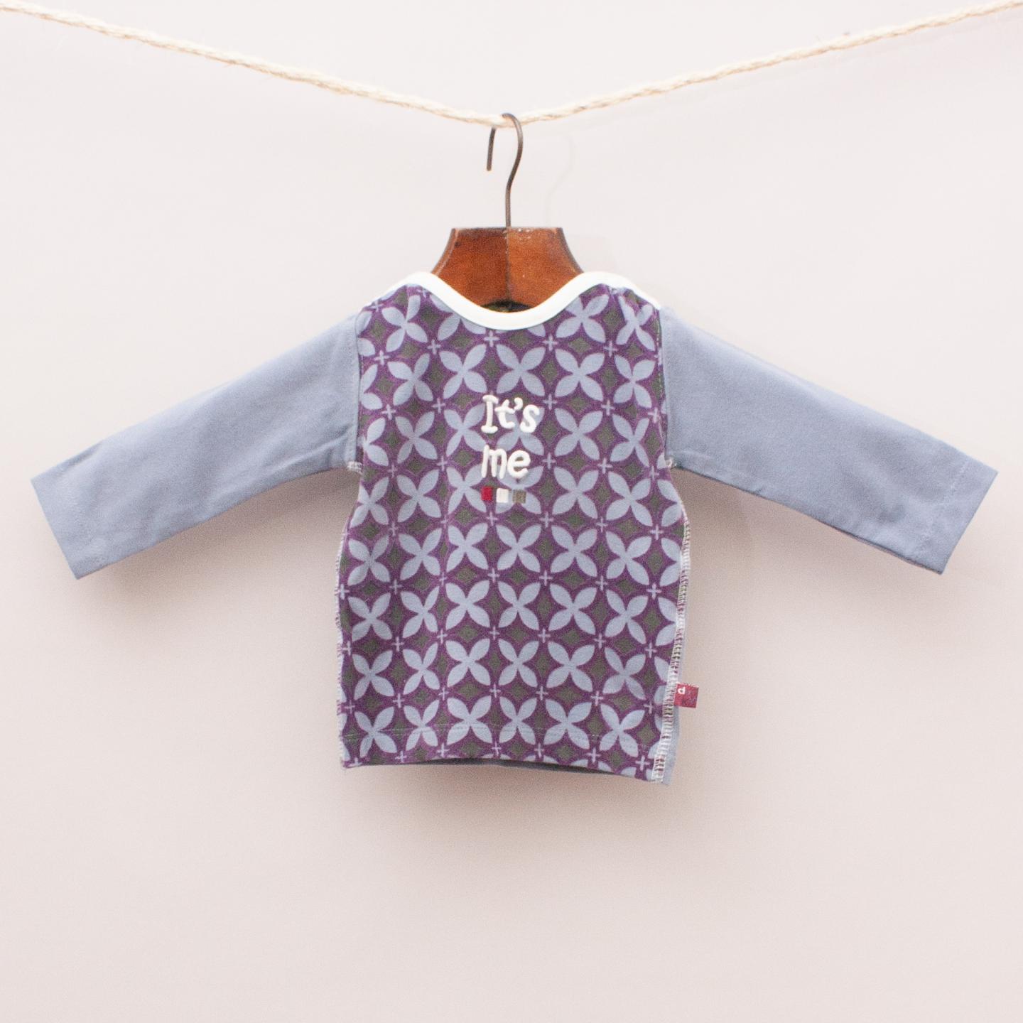 Ducky Beau "brand new with tags" grey and purple patterned long sleeve with cream neckline and snap button closures