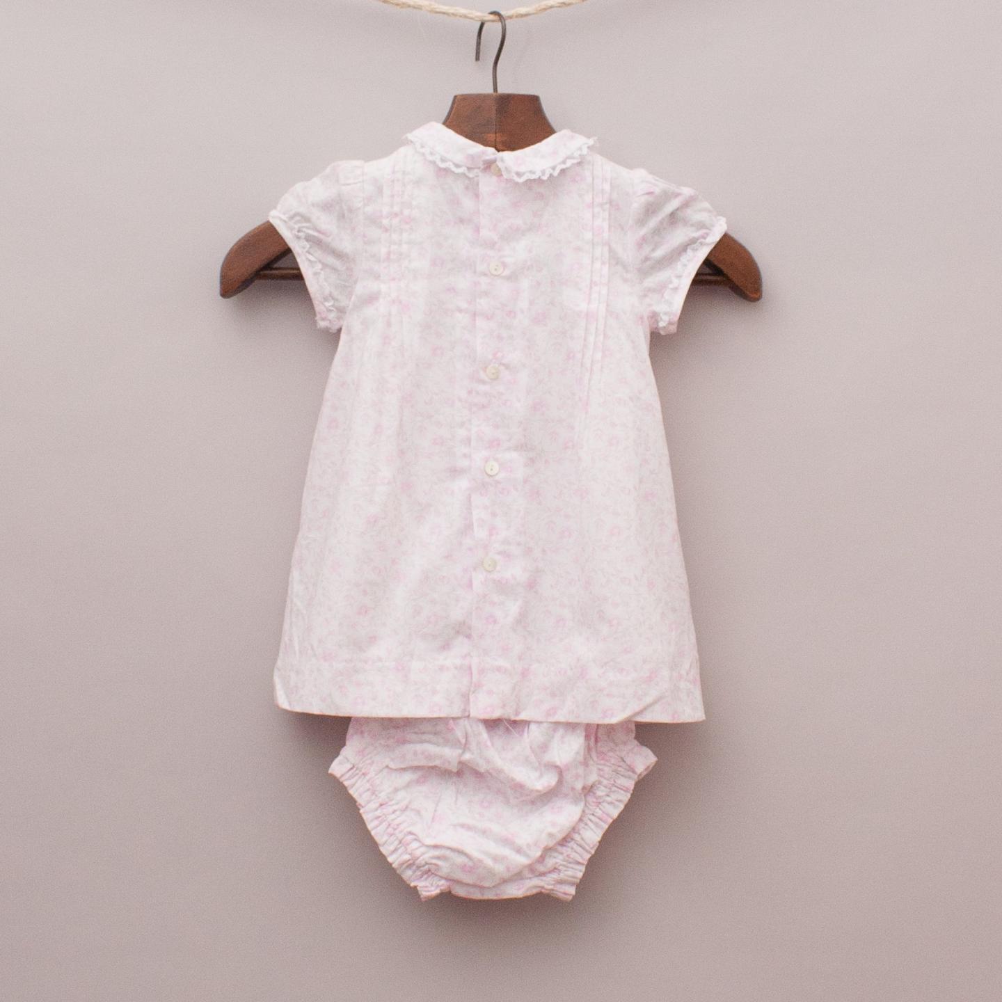 Dulces "brand new with tags" pink sheer floral patterned dress with lace edging, pleated and button detailed front, full button down back with matching bloomers