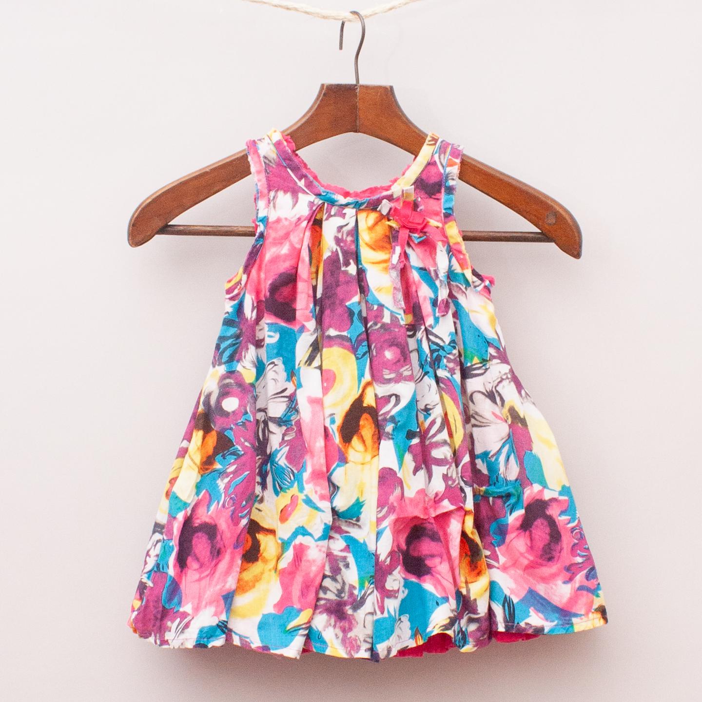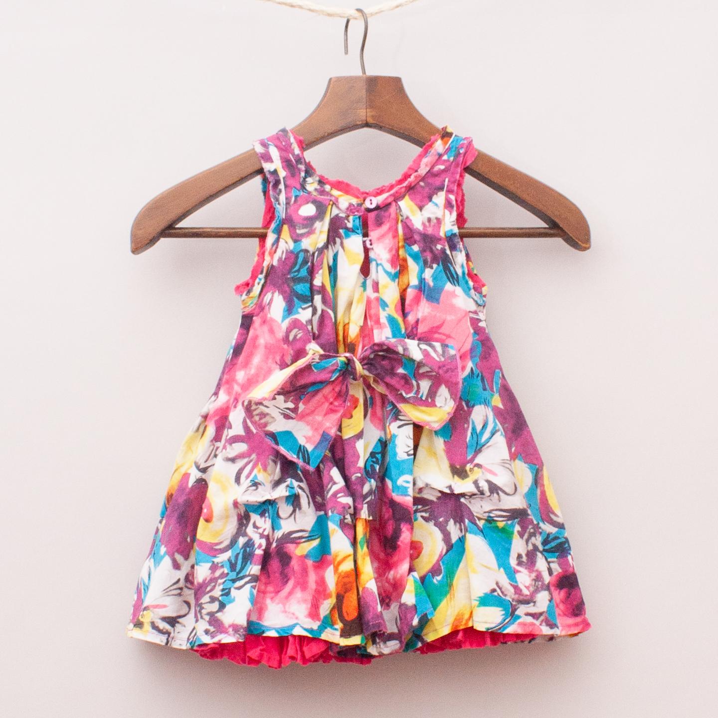 Elaine et Luna multi coloured patterned dress with pleating throughout, hot pink lining, tie back and button back closure *100% Cotton