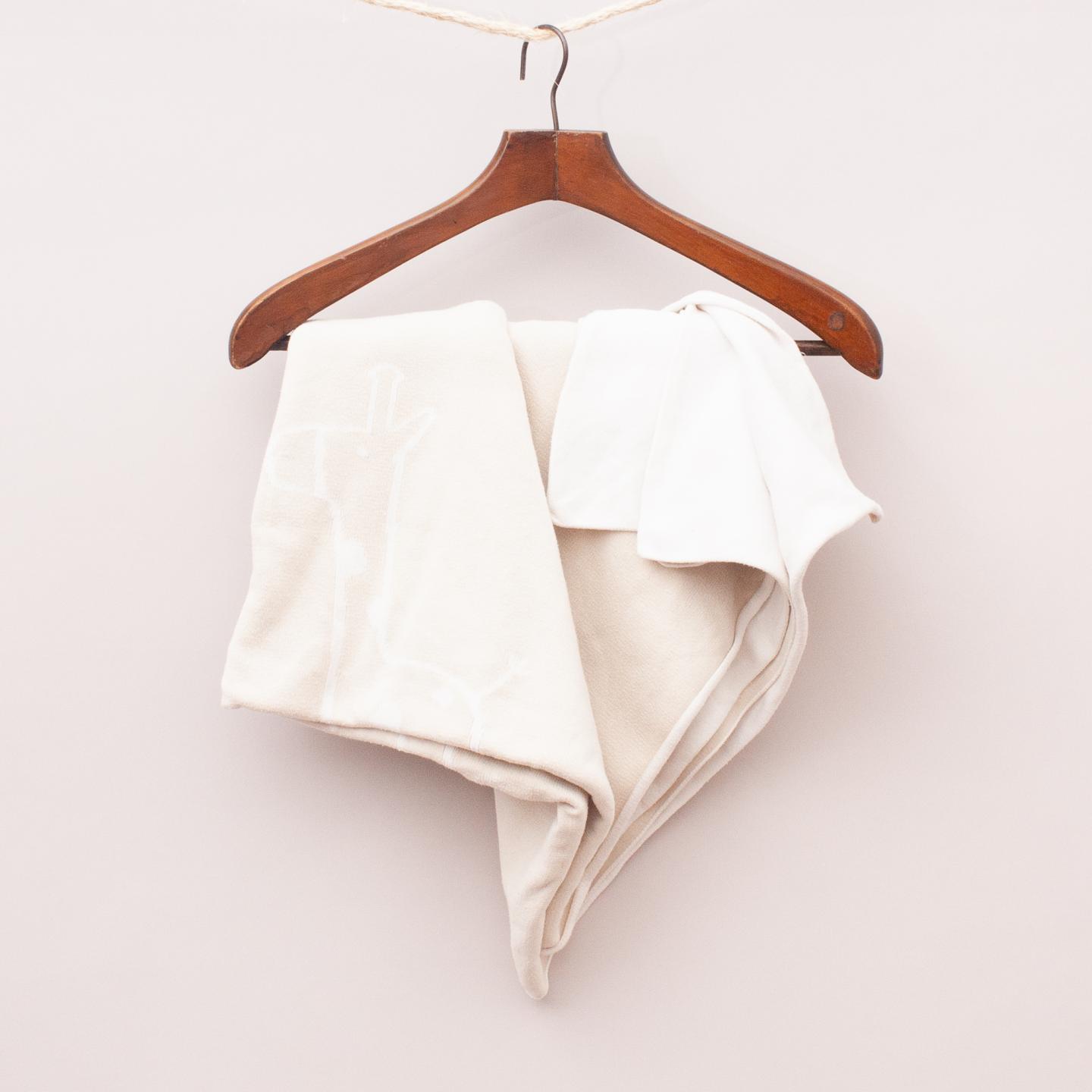 Emotion & Kids beige and white baby blanket with giraffes printed throughout - Small hole on underside. *100% Cotton