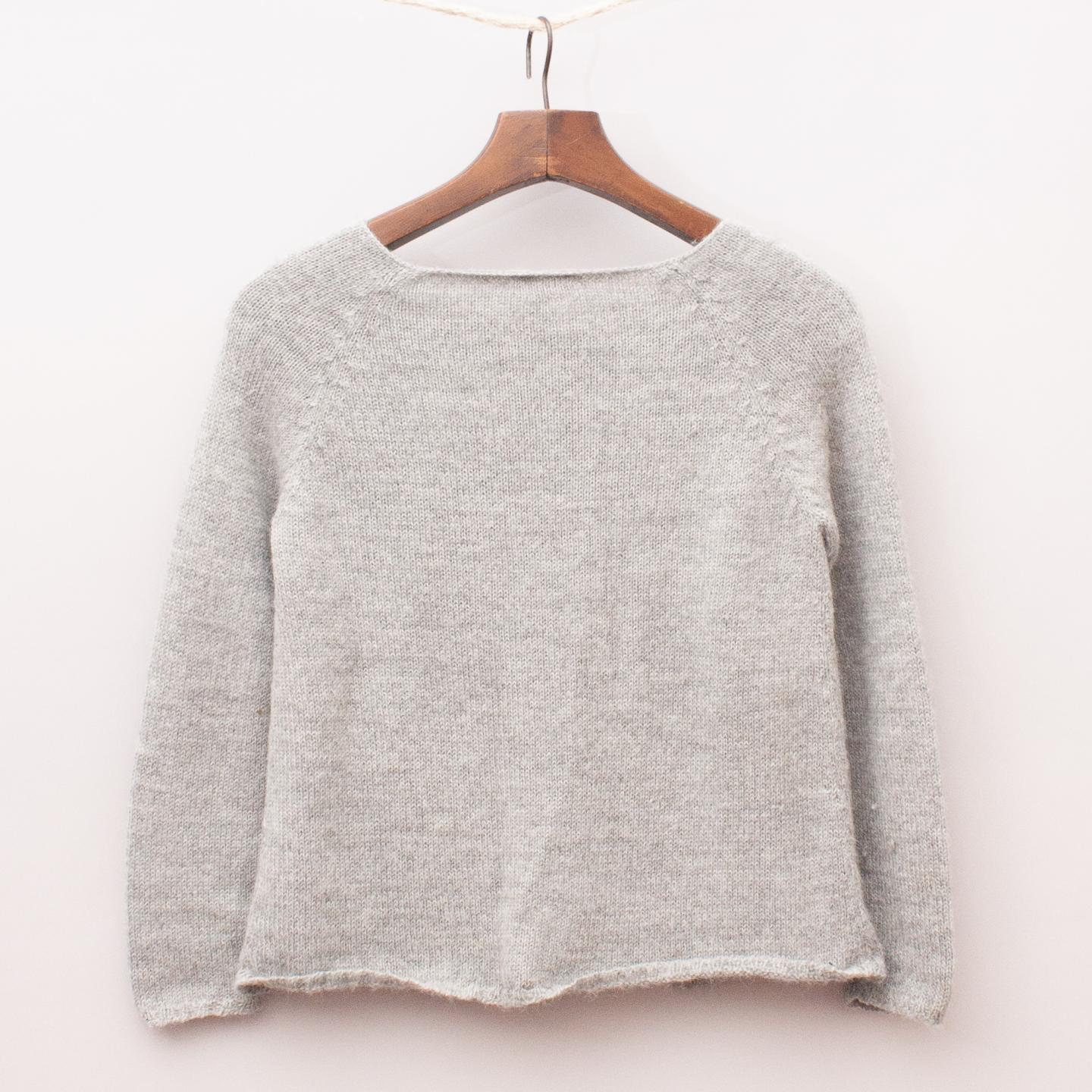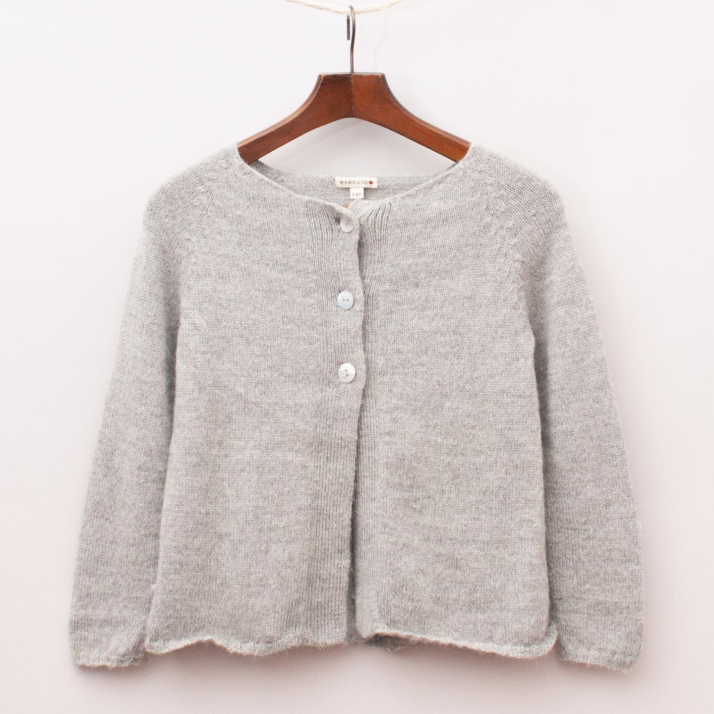 Esencia grey knit cardigan with raw edge neckline and pearl buttons *100% Alpaca