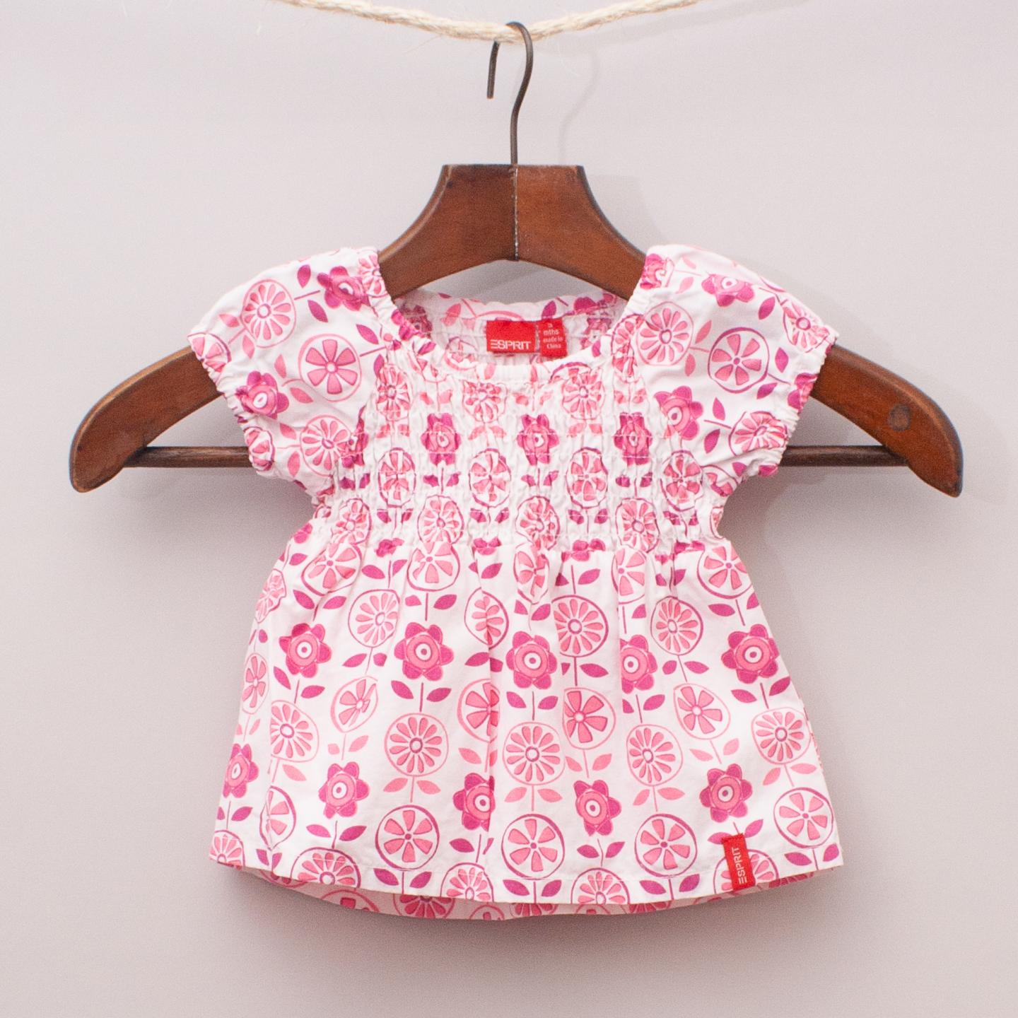 Esprit pink and white patterned top with ruched front, puffed sleeves and elastic neckline *100% Cotton