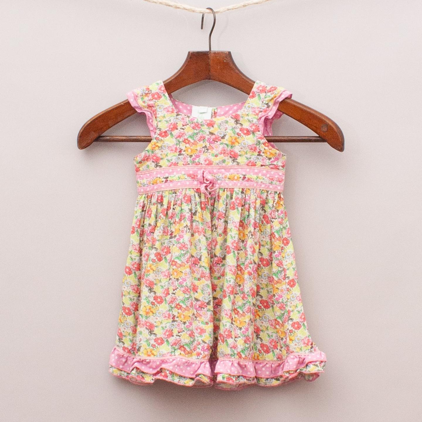 Eternal Creation coloured floral dress with polka dot ruffled trim, gathered and full skirt with button down back closure